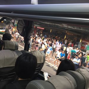 ネイザンロードに入ると、バスは看板の下を走り抜けていきます。ジェットコースターのような感じではありません。あくまで安全運転。ここでも、要所要所で撮影のためにバスを停車してくれます。我々のバスは4組のみなので、座席も選びたい放題、いろんな角度から撮影ができ、参加者同士で撮影依頼をし合うなど、とてもアットホームな雰囲気でした。
