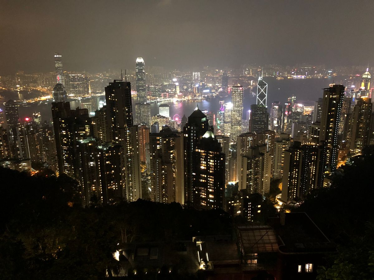 夜の香港の街を見下ろしたり、見上げたり