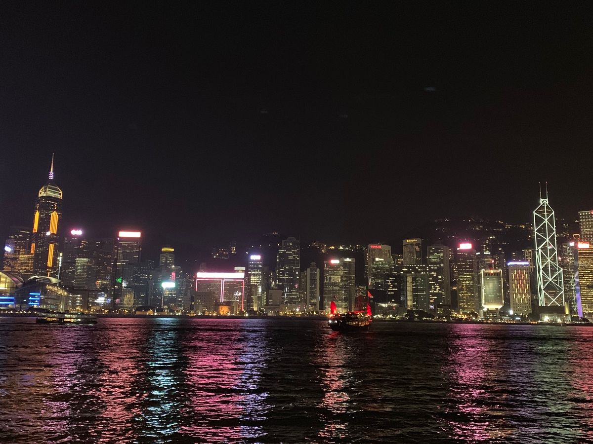 デモの影響で参加当日にストライキがあり、ツアー参加者は少なかったです。そのおかげで?子供が座りたがっていた一番前の席に座り、ハーバー沿いの夜景や街中のきらめくネオンを間近で観ることができました^^