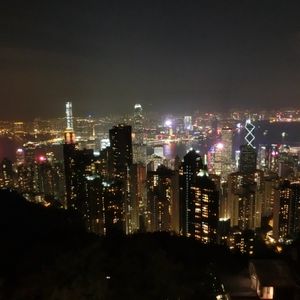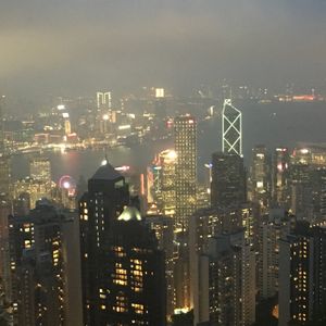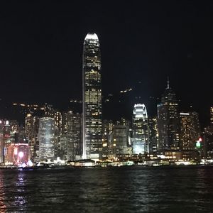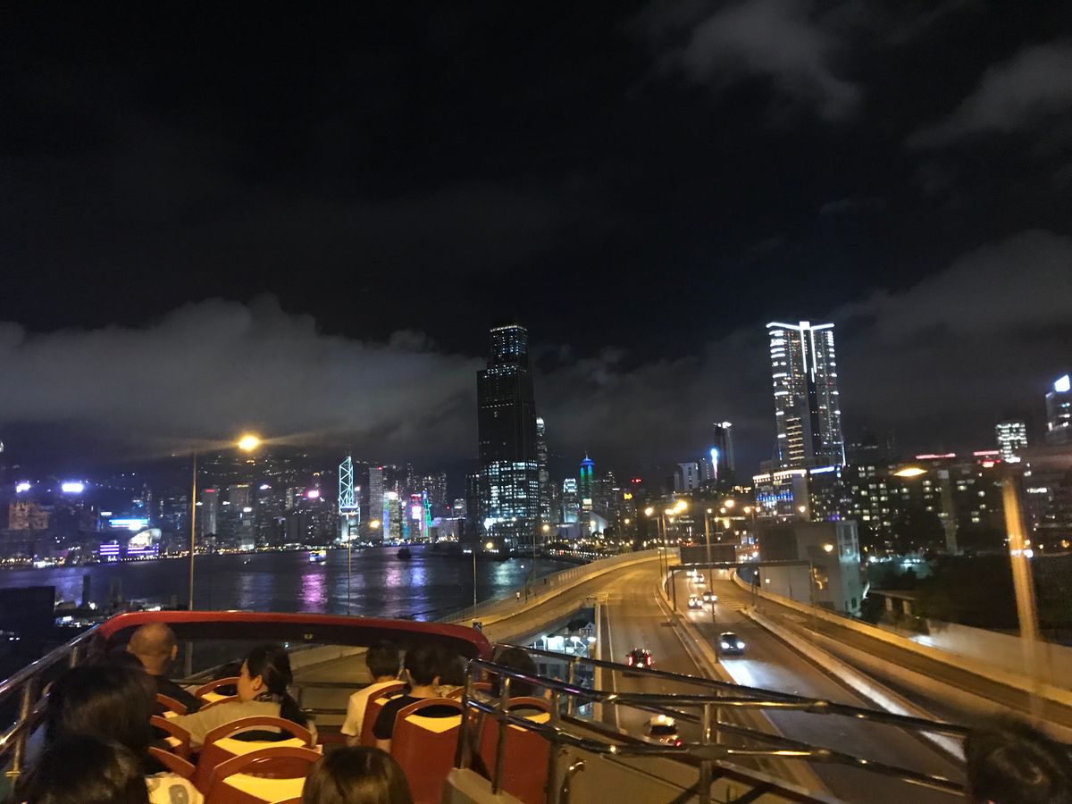 ビクトリアハーバーの夜景、高層ビル群の光はとても綺麗でバスからゆっくり見ることができます。