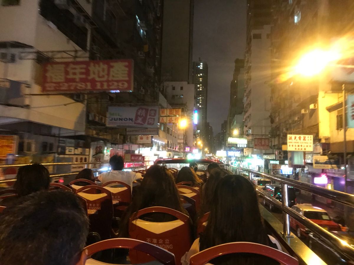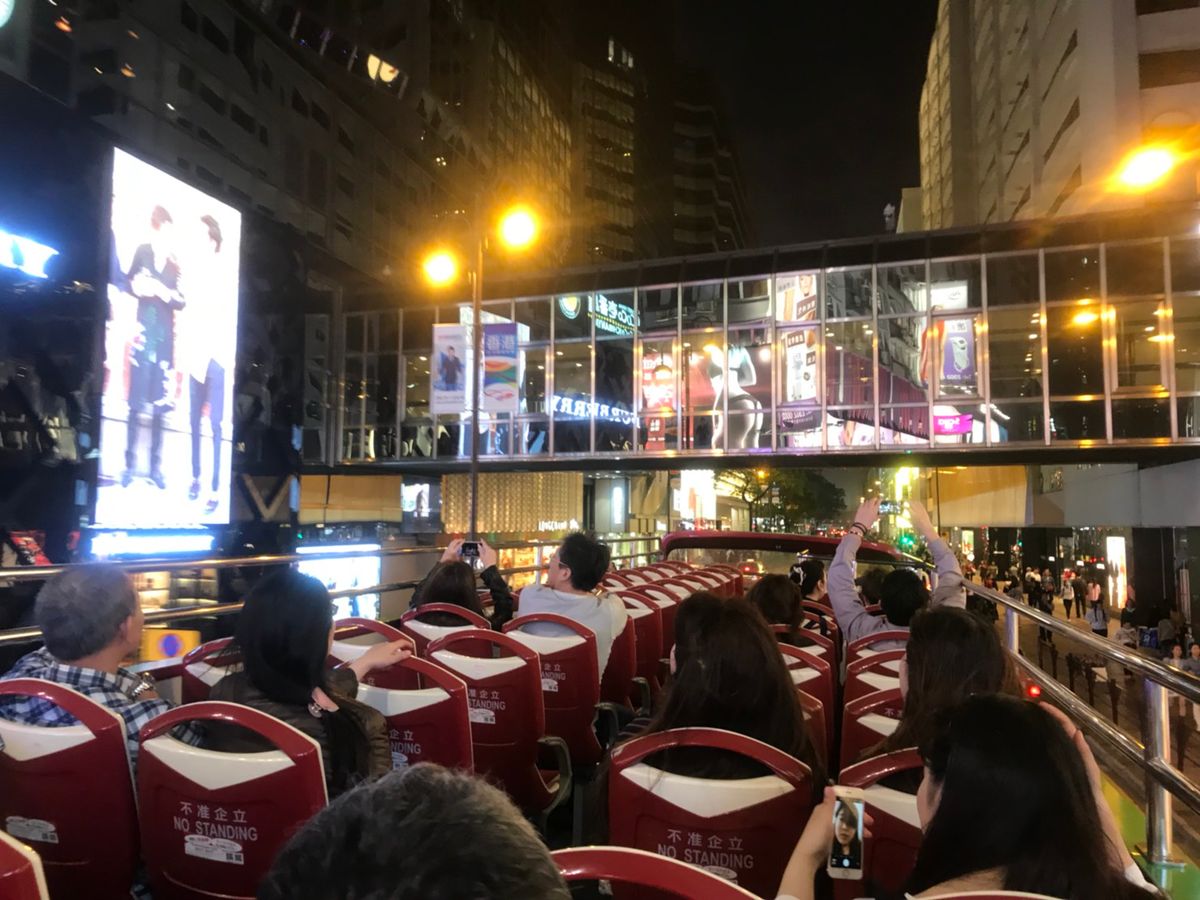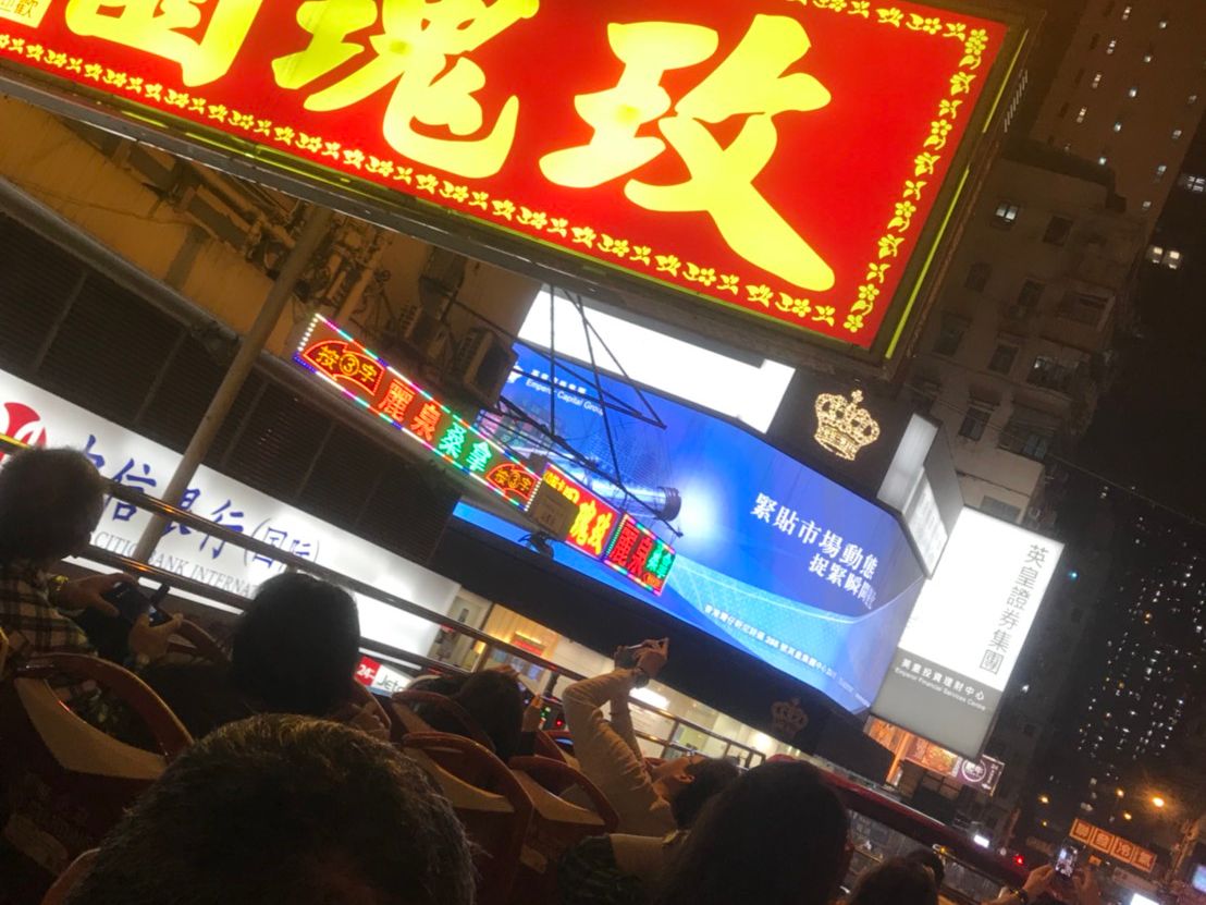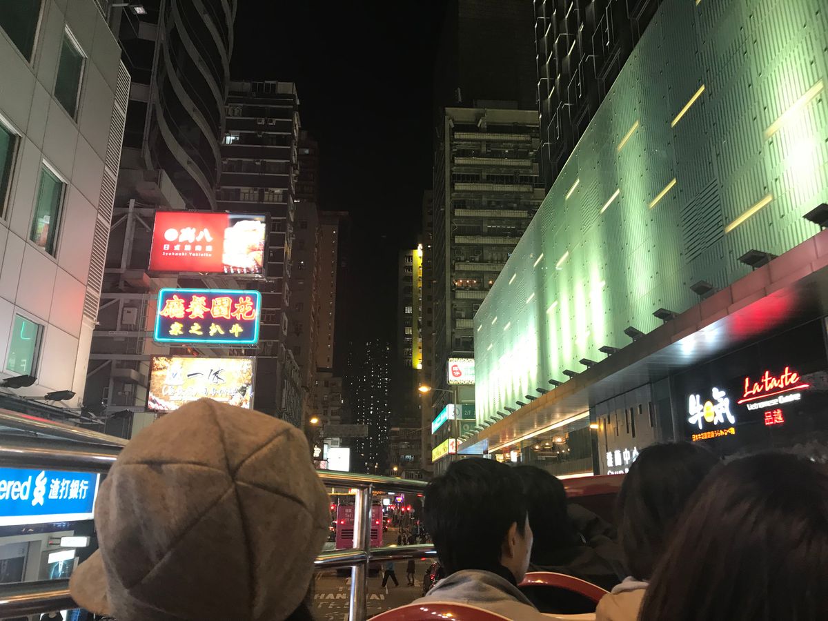 夜の香港を2階建てオープンバスで市内観光とっても面白かった!特に2階最前列に座ったこともあり、スピード感抜群でまるでジェットコースターに乗っているようでした。それでも楽しい思い出になりました!