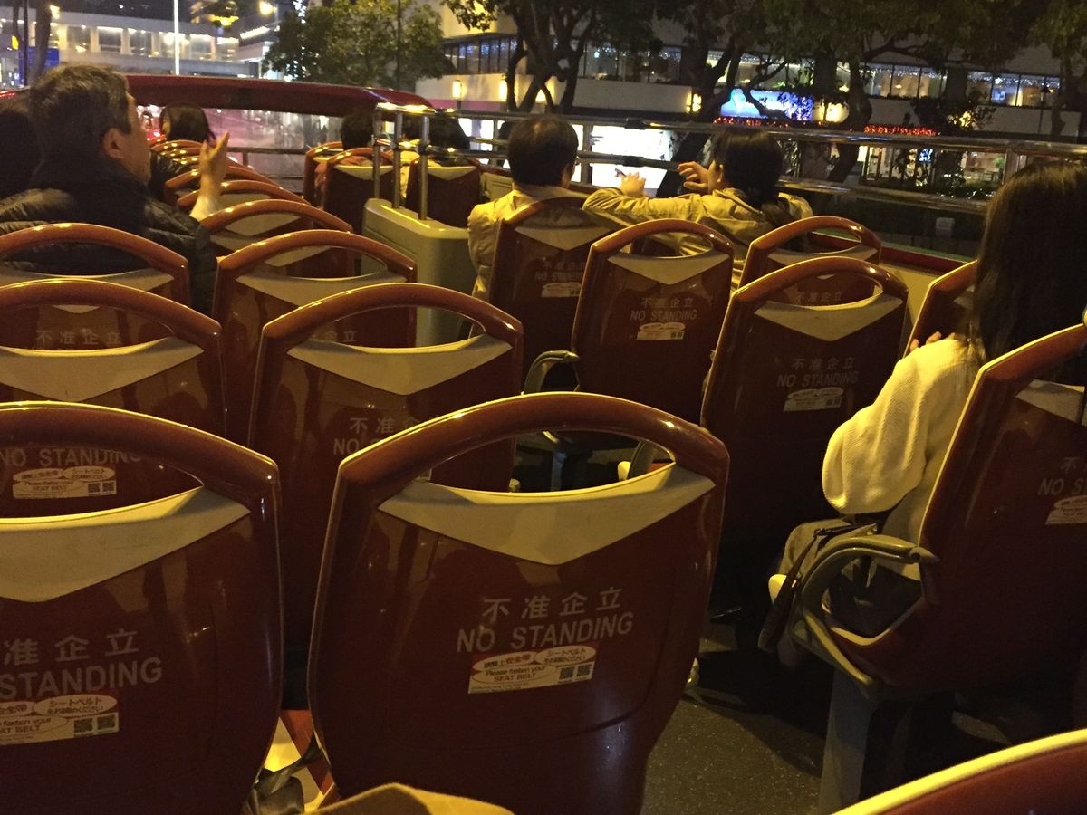 ガイドさんは日本語で色々話しているようでしたが、内容は後ろの席だとほぼ聞こえませんでした。バスは街の中心街を走るので、夜の香港の雰囲気を楽しむことができます。