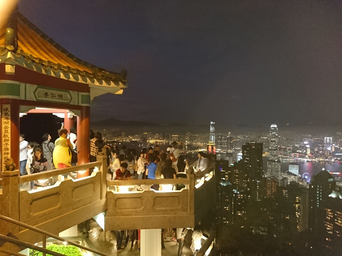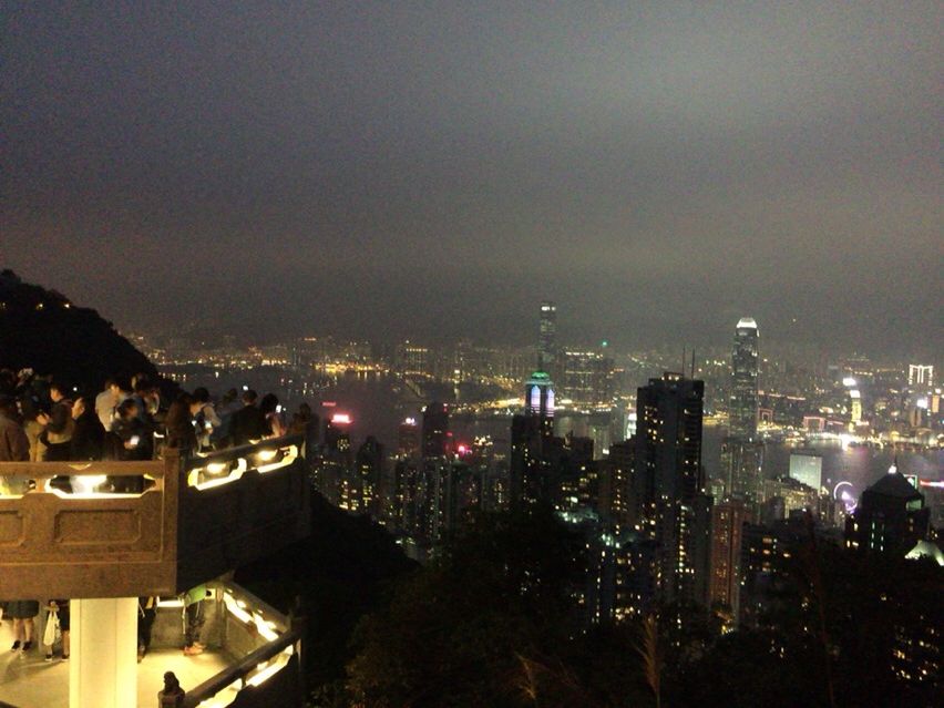 昼もツアーに参加したのですがたった9人。一方で夜は30人くらいいて、やはりみんな夜景を見にきたのだなと思いました。昼もピークトラムに乗ったのですが、夜はけた違い。ディズニーのアトラクションに5分で乗れるのと1時間かかるときくらいの差がありました(笑)。自力で行くより、ツアーがいいかもしれないです。夜景はとっても綺麗でした。でも一番いいポジションの上のひさしみたいなところに登る時間がなくて残念でした……登れたのかな。