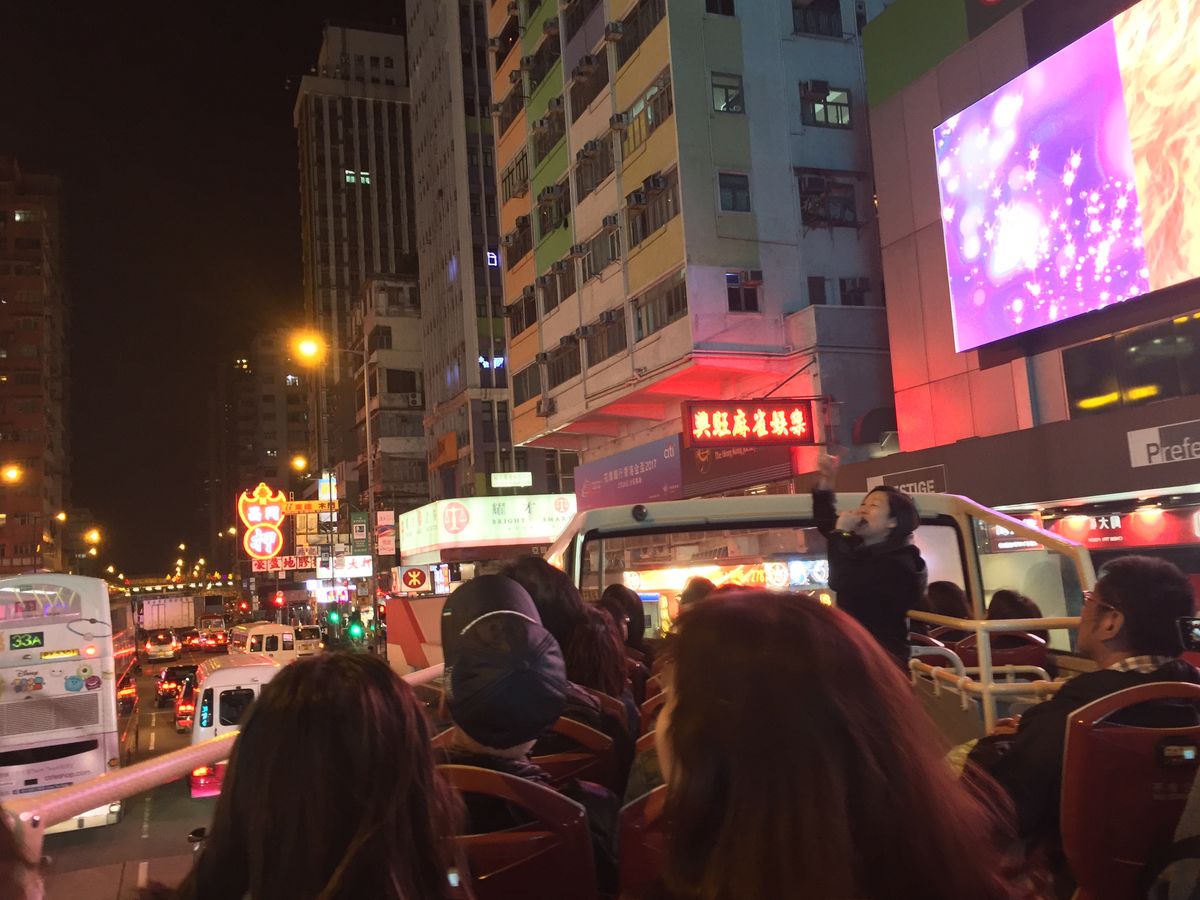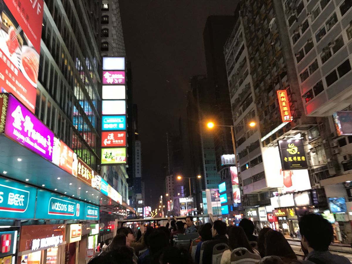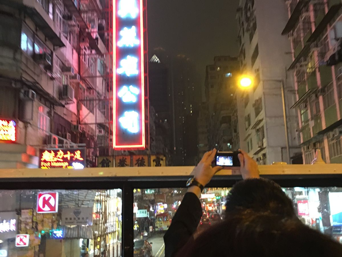 また、オープントップバスの方も、香港名物とも言える、街中での看板のせり出しのギリギリのところを通るのは圧巻でした。