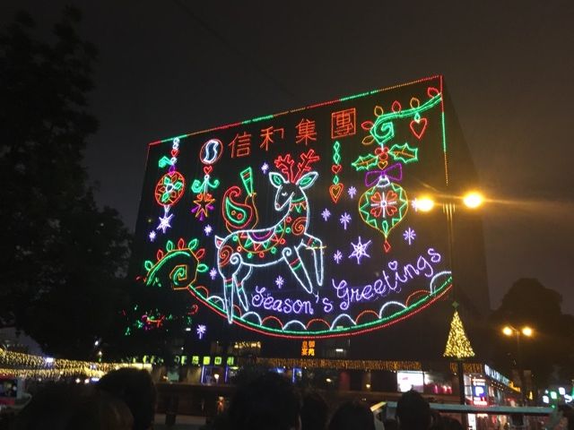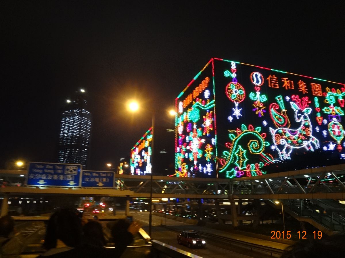 シンフォニーオブライツを見たかったので、時間の都合からこのパンダバスを利用しました。クリスマスシーズンだったのでビルにはクリスマスのイルミネーションがありました。看板が道にせりだしたところでバスが止まってくれて、ガイドさんが写真を撮ってくれました。
