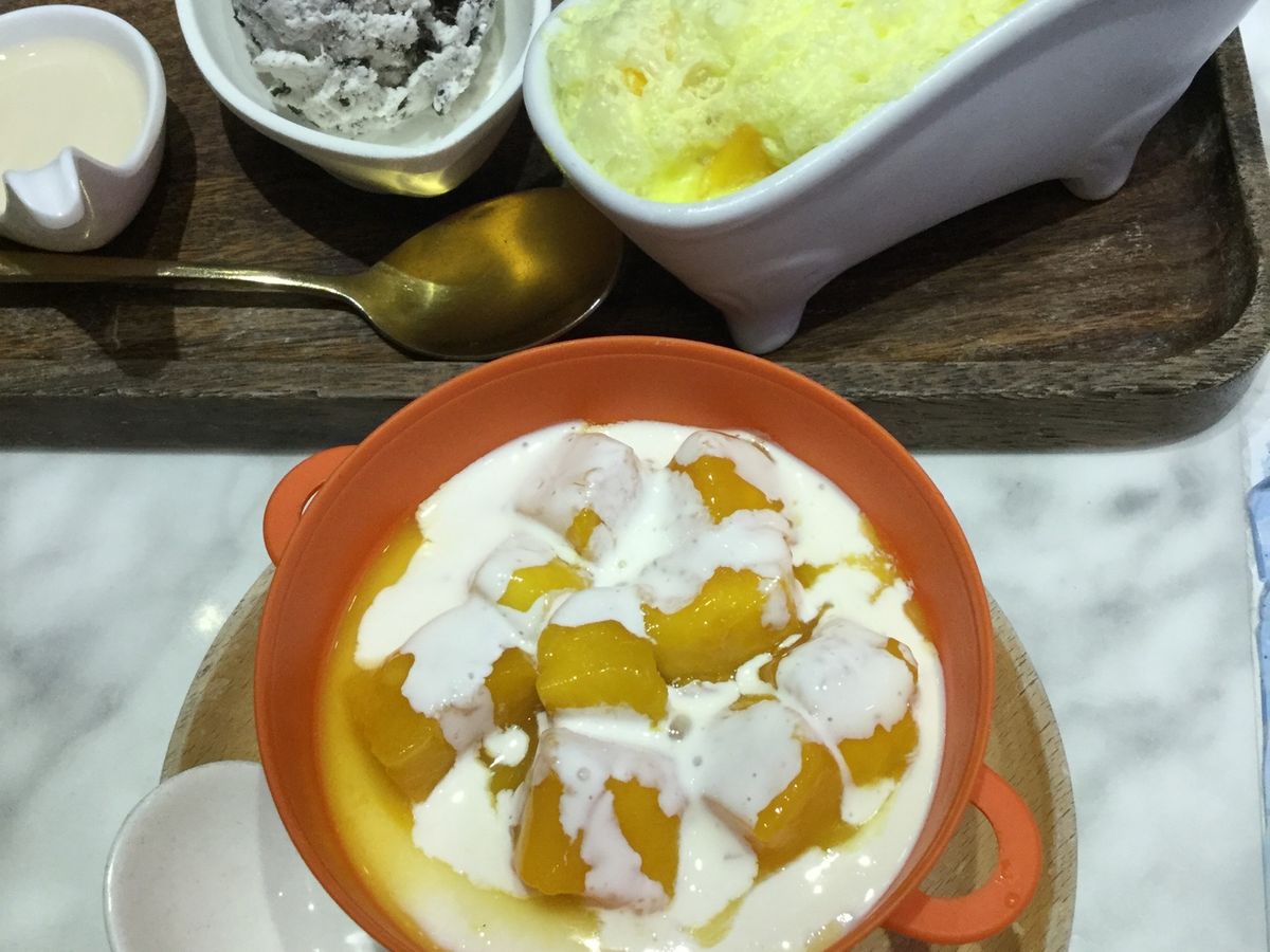 怪しげな品物が並ぶ道で、私は特に買うものも無かったのですが、散策時間たっぷりだったので、近くの香港らしいデザートが食べられる店に入って牛乳プリンやマンゴープリンを楽しみました。