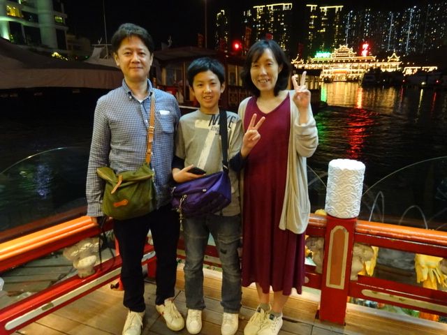 オープントップバスでのドライブは、日本では体験できないものだと思います。これに乗ってテンションの上がらない人はいないのではないでしょうか。高い場所から香港の街の様子を見ることができて、風が気持ち良く異国気分を十分味わうことができました。ここでも家族みんなでガイドさんに記念写真を撮っていただきました。いつまでも乗っていたいほど楽しい時間を過ごすことができました。