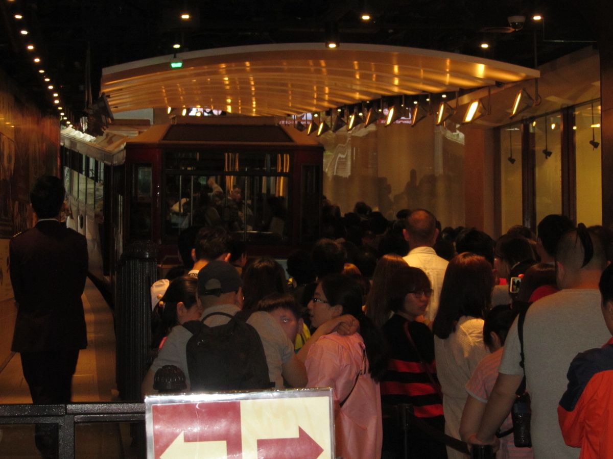 ビクトリアピークでは、夜景の時間を狙いトラム待ちの人がワンサカ