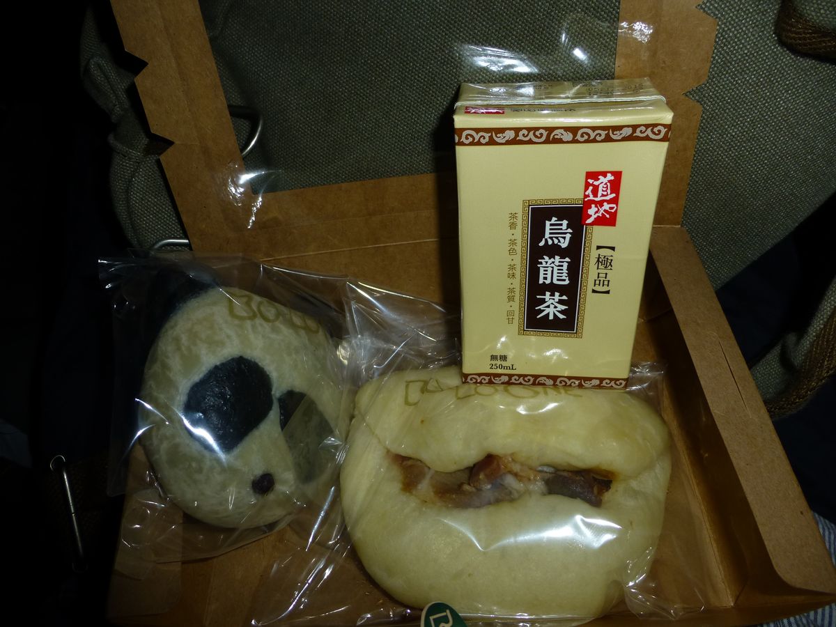 バスに戻ると軽食がありました。チャーシューパンとパンダの形のアンパンは、どちらもバスの中で食べやすい大きさでした。次の目的地まで30分ほどあり軽食を出してもらうタイミングも良かったです。