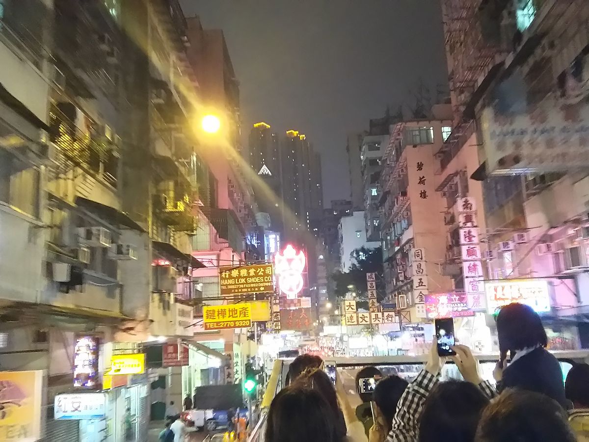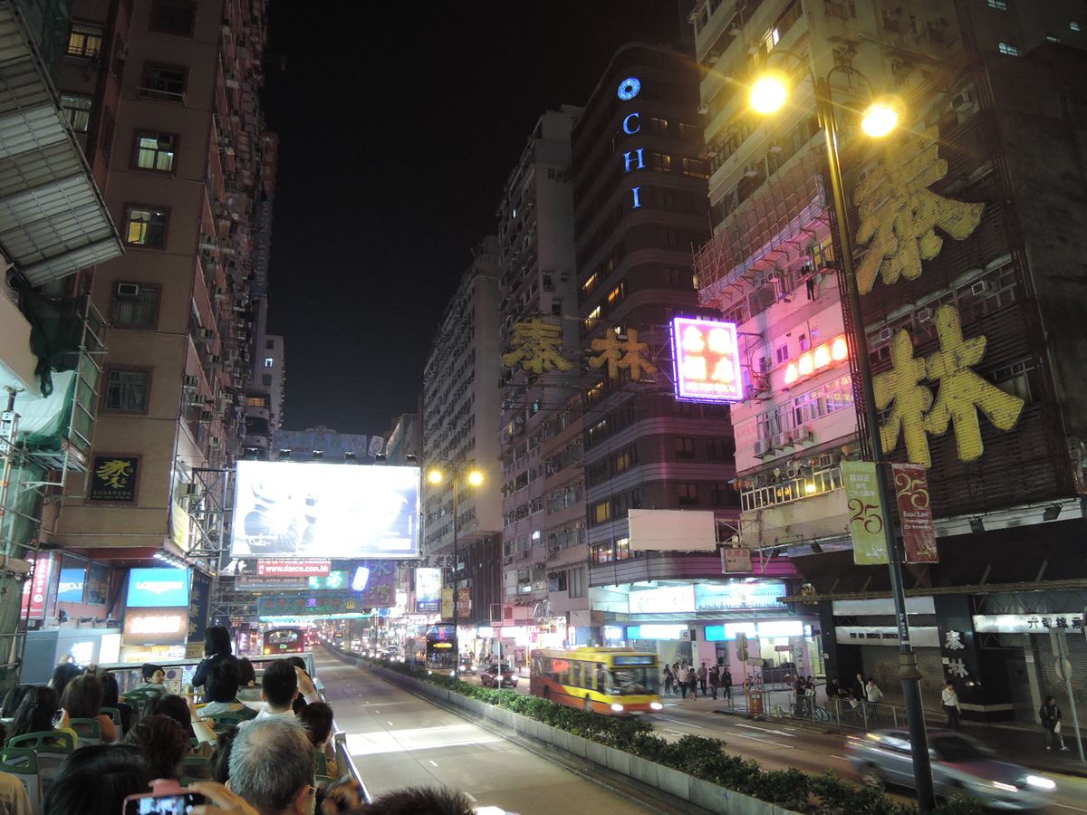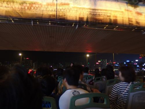 しばらくしてからオープントップバスが来ました。外を歩く分には薄着で問題のない天候でしたが、バスに乗った時は上着がないと肌寒かったです。ネオン看板の真下を走るのはこれで2回目ですが、とても気持ち良かったです。帰りに女人街で下車可だったため半分くらいの方が降りました。