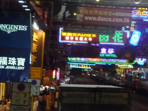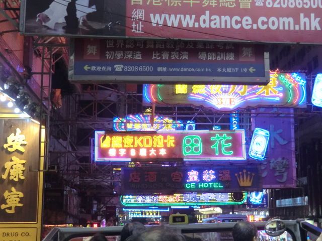ジャッキーチェンの香港映画に出てくる、道路にはみ出してくるネオンサイン、看板の数々の下を2階建てのオープンバスで駆け抜ける…。ときにはジャッキーよろしく看板に飛び乗って(?)…。そんな妄想で香港に行ったら絶対に参加しようとおもっていたツアーでありましたが、バスが通る大きな通りには看板がちらほら、中でも看板が多そうな場所をめざし記念撮影…。何度もぐるぐる同じ場所をバスはめぐり残念ですがお茶を濁された感じのツアーでした。
