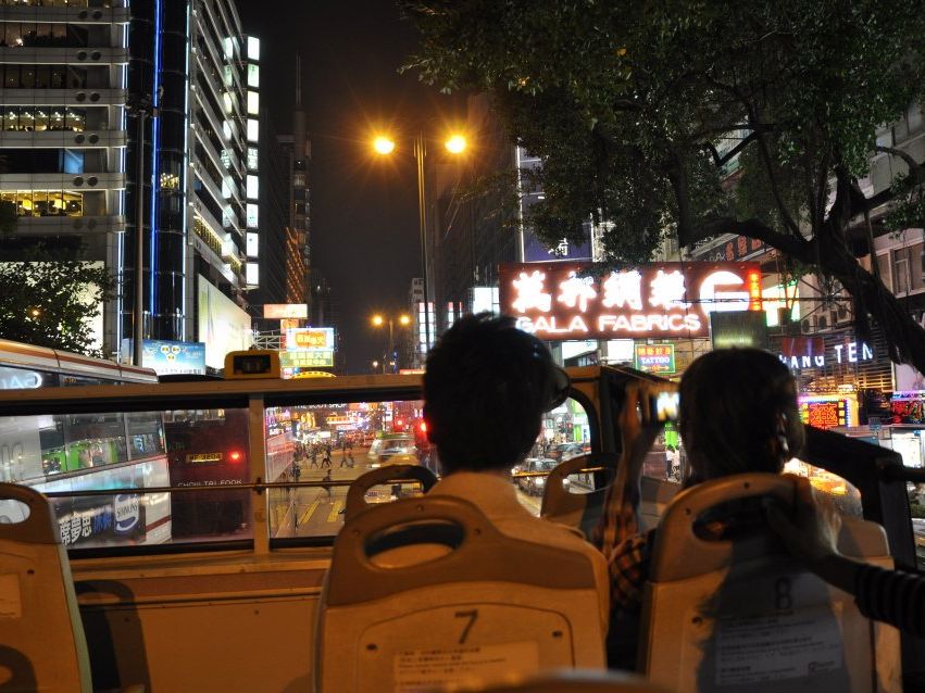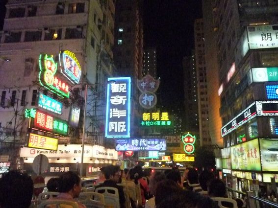 香港へは3回旅行で行きました。そのうち、今年と3年前と、二回オープントップバスに乗りました。一回目は友人と、二回目は母親とです。香港ならではのネオンの輝きが、とても素晴らしく、二階建てバスなので、街を歩く人々を上から見て、なんだかすごい身分になった感じ(笑)バスからの眺めは綺麗です。もう少し欲を言えば、バスから降りて女人街散策を30分とありますがほとんどの人はバスに(送迎用の普通車ですが)戻らず、散策を楽しみます。が、が、添乗員によっては、宿泊先のホテルへ戻る地下鉄のモンコックの駅への行き方の説明が不足し、客からクレームを受けている。確かに・・・あんな所に降ろされて、自力でホテルまで帰るのは、なかには難しいひともいるでしょう。ですから、必ずガイドマップを持参すること。添乗員にモンコックの駅までの地図を描いてもらうこと。これが大切です。