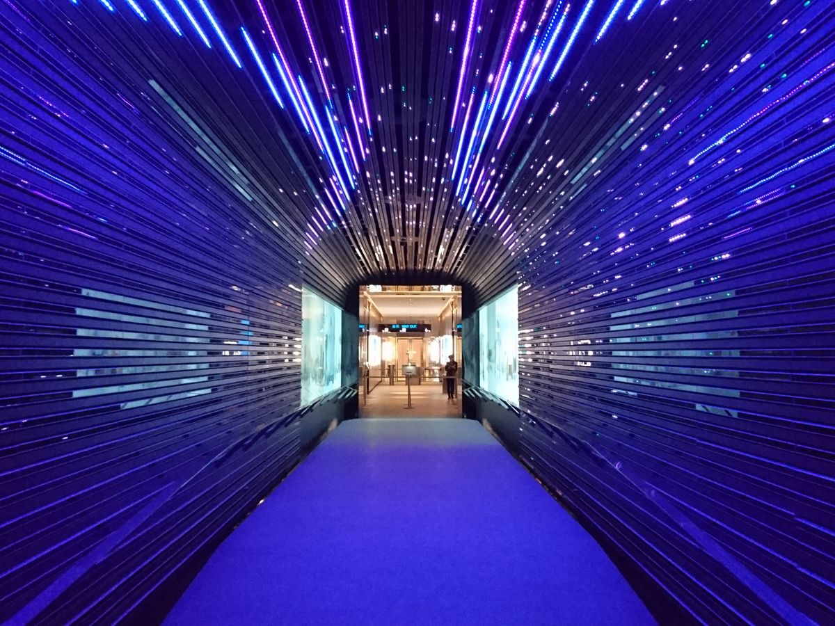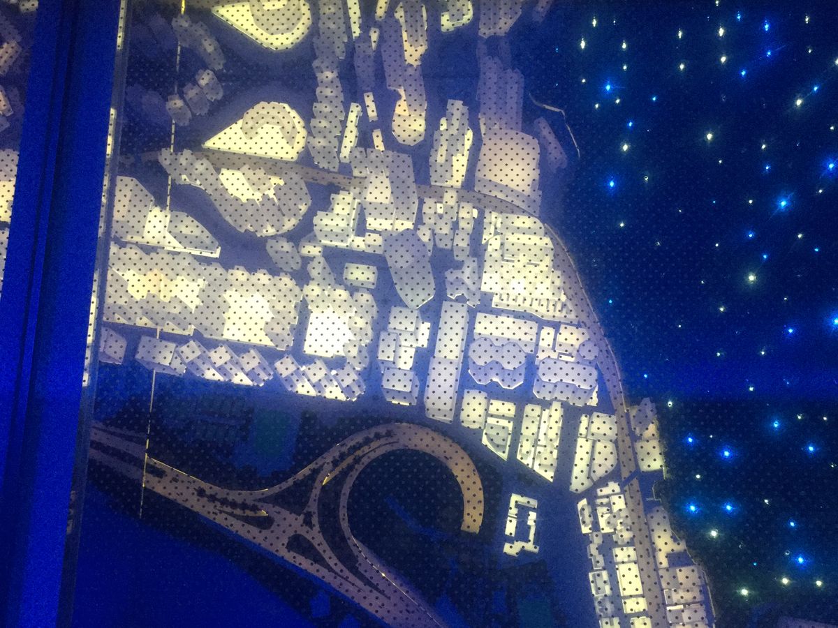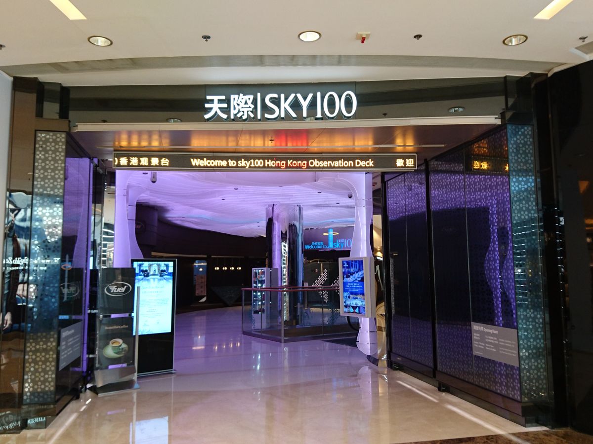 エスカレーター左先にSKY100のエントリーが有り、入って更にエスカレーターで下の階でバーチヤーを交換して、上に戻ってから、エレベーターで向かいます。夜の為か通路の模型が最高に綺麗。
