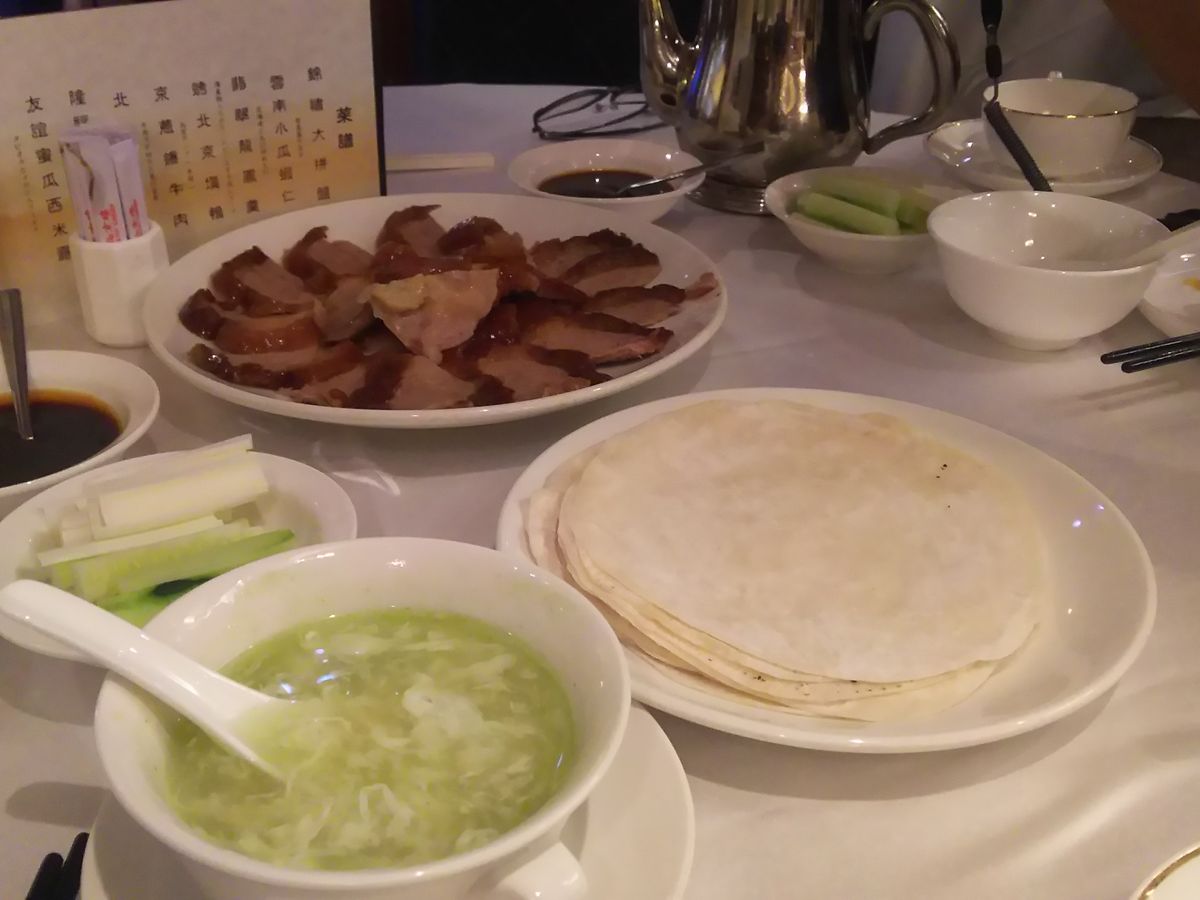 席に着いたら前菜到着。癖もなくおいしい。すると、ウェイターが北京ダックを持ってきた。ここは肉がたっぷりついていることは事前に調査済み。よしいっぱい食べるぞ!