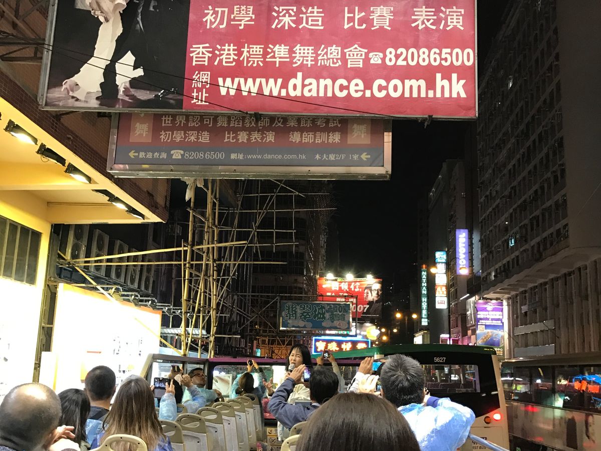 同じ日の朝にパンダツアーに参加しましたが、その時には私達二人だけの参加者でした。それに比べてこの夜のオープントップバスは参加者が凄く多かったです。15分前に待ち合わせ場所のホテルに着くと既にガイドさんは来ていて、参加者も大半は集合してました。こんなに多くて、全員二階席に座れるのかな?と思いましたが、なんとか全員座れました。まず、チムサアチョイの海岸沿いを走ります。地下道をくぐるのですが、天上ギリギリでまるでジェットコースターのよう、トンネル入る時の風圧が凄くて面白かったです。それからネイザンロードに戻りジョーダン方面へ。看板はあるけど、以前に比べて少なくなった⁈ そこでは、ガイドさんが1組づつ写真を撮ってくれます。たつと看板に手が届きそう、でも、届かない。そこから、女人街を通り、一旦停止し、ここで降りる人はさようなら。時間もそこそこ長すぎず、短か過ぎず、夜にちょっちょっとした観光をするには丁度良いのではないでさょうか。