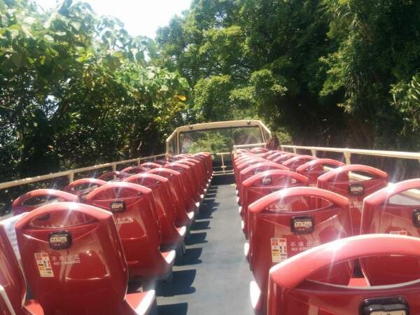 迫りくる看板の下や、トンネルの天井を意識して走り抜けるのは風が気持ちよいし、上から見下ろしている雰囲気も圧巻でした。ガイドさんの声が屋根がなく外のためか聞こえにくいのが難点でした。最後にバスの上で雨が降りましたが、ほとんどぬれずに終了。お粥がおいしかったので