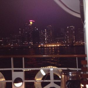 スターフェリー乗り場までは歩きですが、それほど距離はありませんでした。スターフェリーには、スムーズに乗れ、お菓子とドリンクのサービスは嬉しかったです。さて、メインのシンフォニーオブライツの鑑賞です。もともと、感動的な綺麗さの夜景の中での音楽&レーザー光線、ネオンのショーなので、ショー自体に感動は少ないですが、癒されます。ただ、港で見るより、よいところは香港島、カオルーン島両方のショーが左右で見れるところです。ビデオ撮影をして、後でみましたが、あの時のことを思い出すと、何度見ても、癒されます。間違いなく、心に残る癒されるショーです。この香港でしか、体験できないフェリーの上からの、ショー体験!是非、おすすめです!