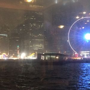 今回母親と2人で初めて香港に行きました。夜の自由時間の間に、有名な香港の夜景を満喫したい!と思い、こちらのツアーに参加しました。キャンペーン中でツアー料金がお得になってラッキーでした。ツアーの内容は、まずカオルーンホテルロビーに集合してから、1881ヘリステージに歩いて向かいました。ホテルから近くにありました。女性のガイドさんはとても親切な方で、ヘリステージの歴史を説明してくれたり、建物の写真を撮ったり、おしゃべりしながら楽しく過ごせました。その後、フェリー乗り場まで少し移動しました。ガイドさんがチケットの手配をしている間に、時計台をみてまわったり、夜景をバックに写真を撮ったりしました。ガイドさんはフェリーには一緒に乗らないとのことで、少し不安でしたが、乗る直前まで並んでいる列までついてきてくれて、フェリーの中で鑑賞しやすい場所等を教えてもらえたので、特に問題ありませんでした。優先列?だったのか、最初のほうにフェリーに乗ることができました。週末だったので、船内は混雑するかなと思いきや、意外と空いてました。窓際のテーブル席を確保でき、のんびりできて良かったです。ドリンクとクッキーは船内でもらえました。メインのシンフォニーオブライツは、天気が曇ってたせいか...建物からのレーザーが放たれてるのかがよくわからず、少し残念でした。でも街並みの夜景はとっても綺麗で感動しました。またイルミネーションがクリスマスverになってるのもあり、テンションが上がりました。フェリーからだと、香港島と九龍島両方の夜景をいっぺんに楽しめるので、オススメです。あっという間の一時間でした。フェリー乗り場の近くには、大きなショッピングモールがあるので、ツアーが終わった後に、買い物や夜ご飯を食べることができるので便利です。また海外に行くときには、オプショナルツアーで利用したいと思います。ありがとうございました。