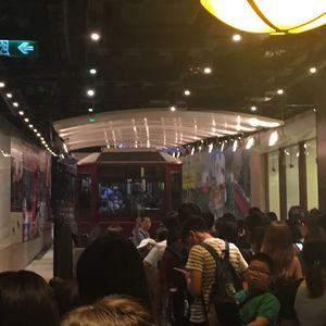 ヴィクトリアピークへはバスを乗り換え、トラムの駅へ向かいます。すごく混むことが多いと言われていたのですが、この日はデモが行われていた影響でトラムの駅にはほとんど人は居なくて、私たちは並ぶこともなくホームへ入り、すぐトラムに乗車することができました。こればかりは運です。混んでいる時はかなり待つそうです。トラムは急坂を登って行くため、途中の高層マンションが曲がって見えたのが面白かったです。