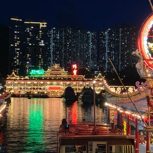 子供連れで参加しました。かわいいパンダバスに乗り、運休中だと思っていたピークトラムが開通していて乗ることができました。トラムは混んでいましたが、ガイドの方が席を確保してくださり、私と下の子で座る事ができました。山頂では自由時間があり、買い物をしたり眺めを楽しんだりできました。時間帯が早かったので夜景ではなく夕暮れ時でしたが、それはそれでキレイでした。夜景はアバディーンへ向かうバスの中から見る事ができました。アバディーンの水上レストランはとってもキレイでした。ジブリの千と千尋〜の映画の中に入り込んだような雰囲気で、子供達もすごーい!と感動していました。