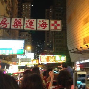 初めての香港なので、初日に家族4人で参加しました。看板すれすれで疾走するバスが香港らしいと思い楽しみにしていました。集合時間前には列が出来るほどで、我々も並びましたが、出発時間になっても案内が無い。ガイドさんに聞くとバスが遅れているとの事。結局19:15出発の予定が19:30過ぎの出発でした。そこから海岸沿いを回り香港等の夜景を見てしばし撮影タイム。その後、ネイザン・ロードを北上し佐敦辺りでまたストップして記念撮影タイム。(ここまではあまり看板が無い)さあこれから下町部分の看板が多く街を疾走する本番と思いきや、これで終了との事。19:50前でした。結局20分足らずの運行、そのうち10分程度は撮影タイムでしたので、走ったのは10分程度。ガイド本で確認すると期待した油麻地から旺角の下町部分だけでなく、広東道などの走行も省略されていました。終わりに当たり、ガイドさんからはこれが全行程のような説明で、その他の何の説明も有りませんでしたので、ガイドさんに確認しましたが、曖昧にごまかしていました。走った距離は地下鉄2駅分程度。これでは高いと言わざるを得ません。