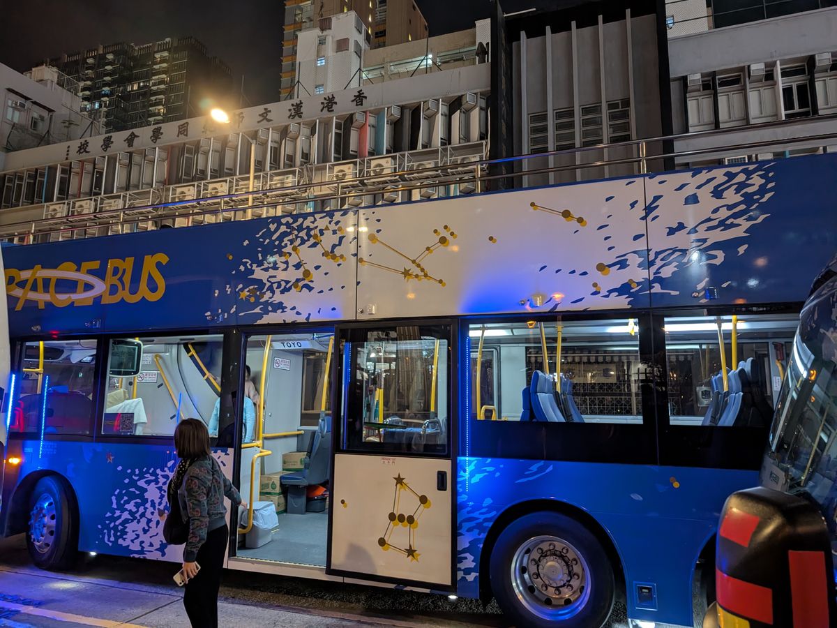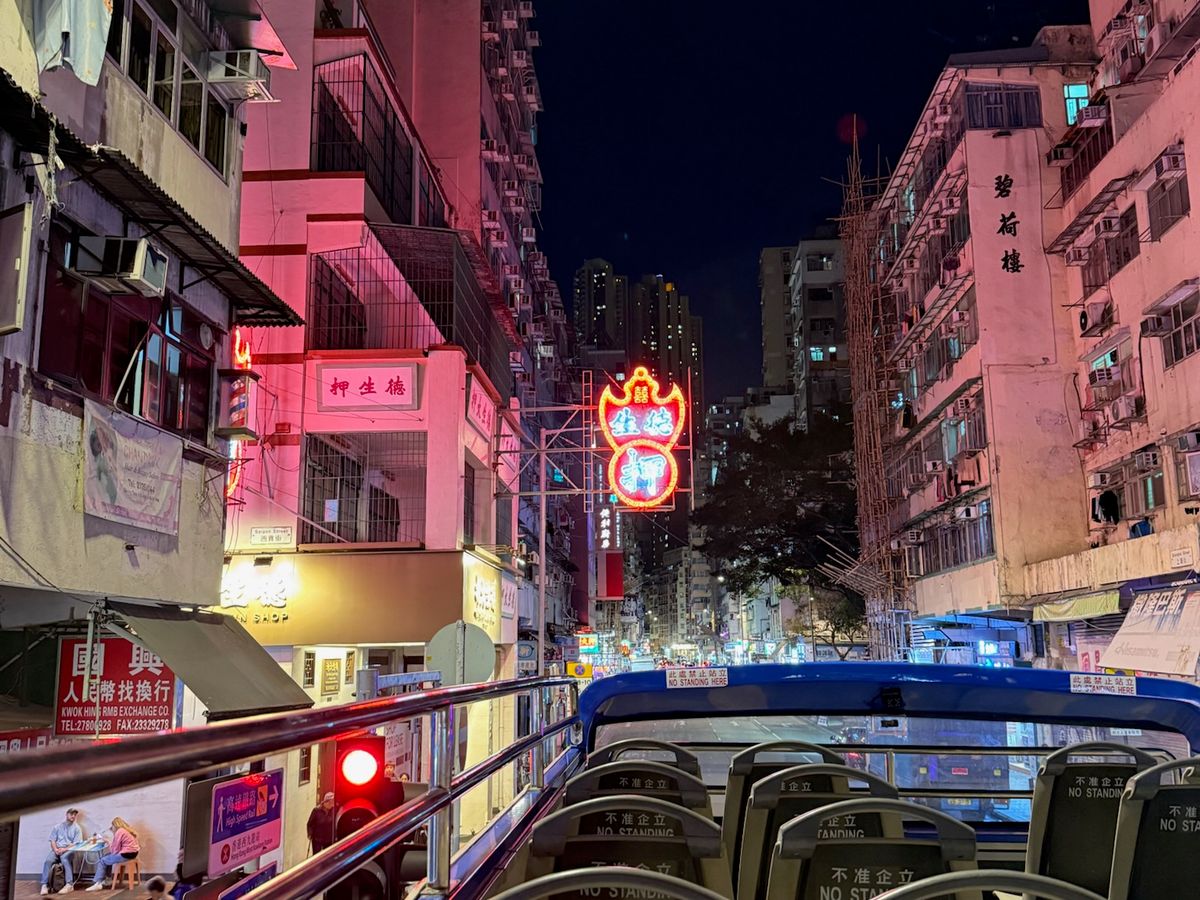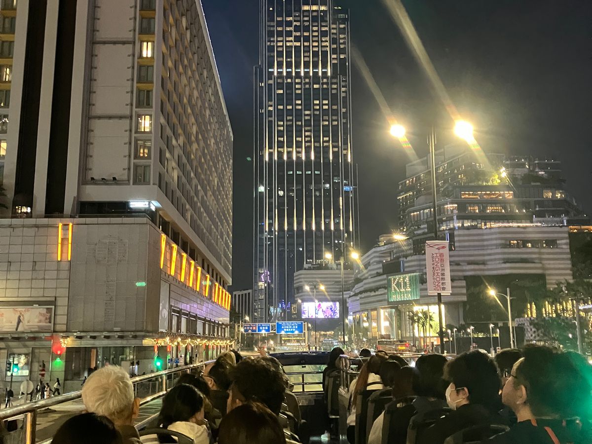 夜景のオープントップバスに乗るのは初めてでしたが、日中とは違って日差しを気にせず、ただひたすら香港の風を感じながら夜景を眺められるのはとても快適でした。