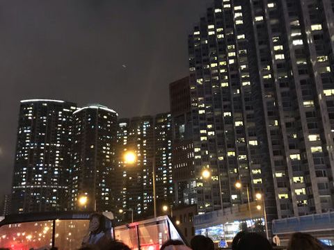私(30代)母(60代)母娘2人旅、初めての香港、ビクトリアハーバーの綺麗な夜景を見ながらバスは爽快に走り抜けます!バスってこんなに早かったっけ?と思うほど風を切って走ります!11月末の参加では涼しいほどでした。冬場は上着を。夏場は快適!!ではないでしょうか。