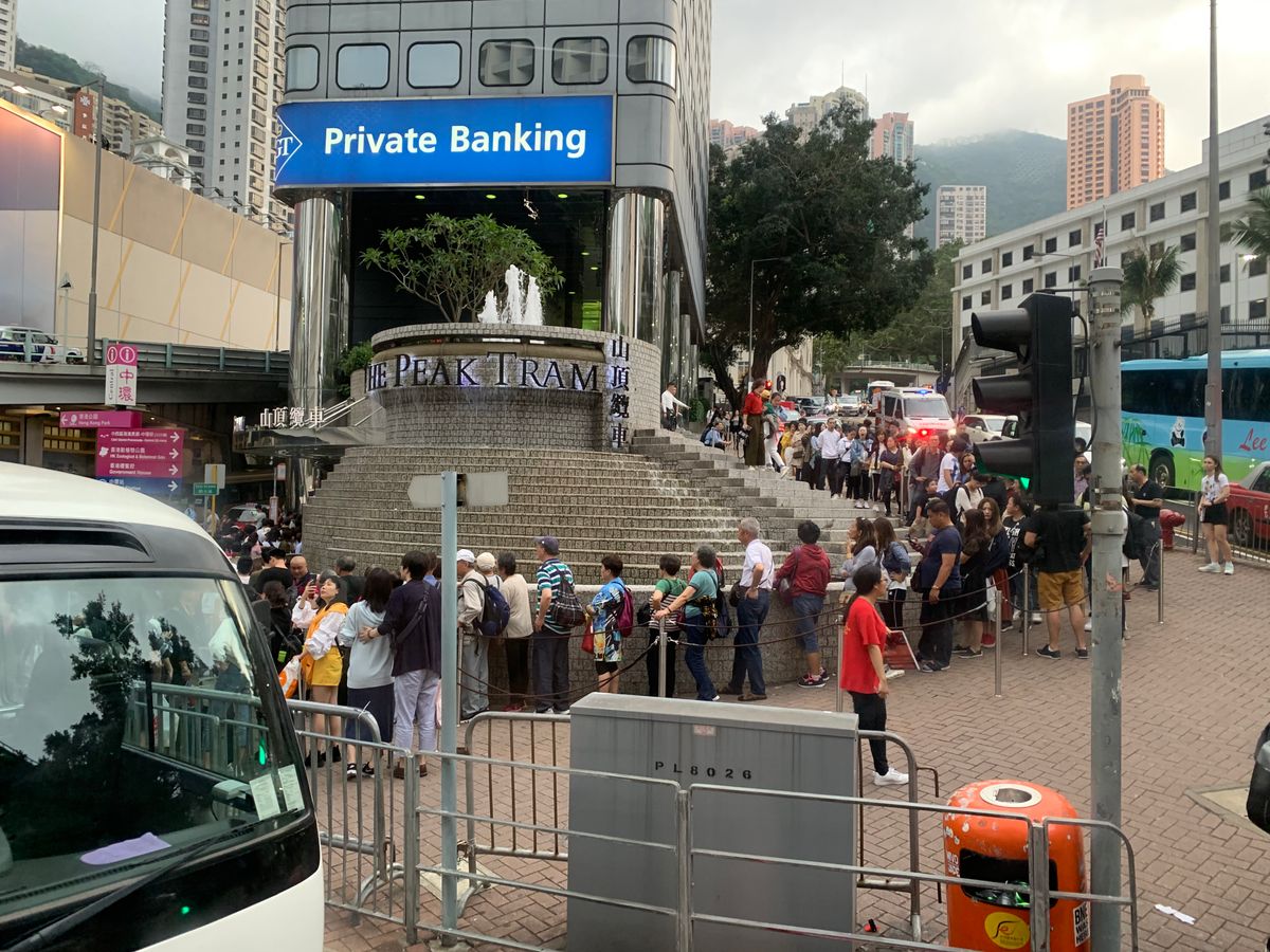 ビクトリアピークに向かうピークトラム、雨のなか長時間待つのはとても大変です。でもツアー参加の私たちは雨に当たらない場所で待機させてもらえました。ピークトラムに乗るまでの待ち時間も短く快適でした。ベルトラさんに感謝です。
