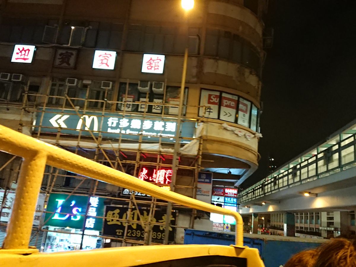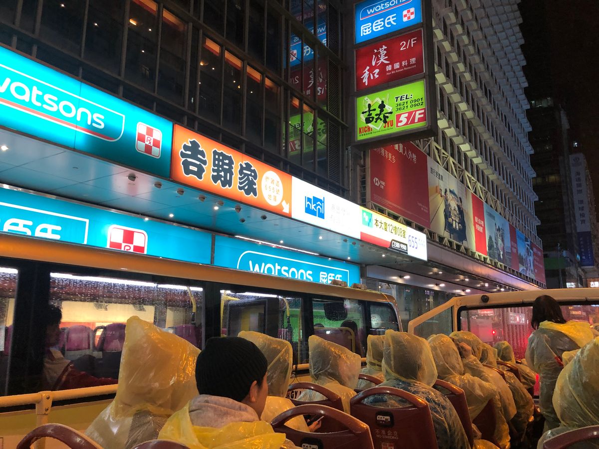 オープントップバスに乗り、1時間程度の香港の街を周遊するだけに3300円/一人はかなり高い。トンネルと看板が近い!と言っても予想の範疇。