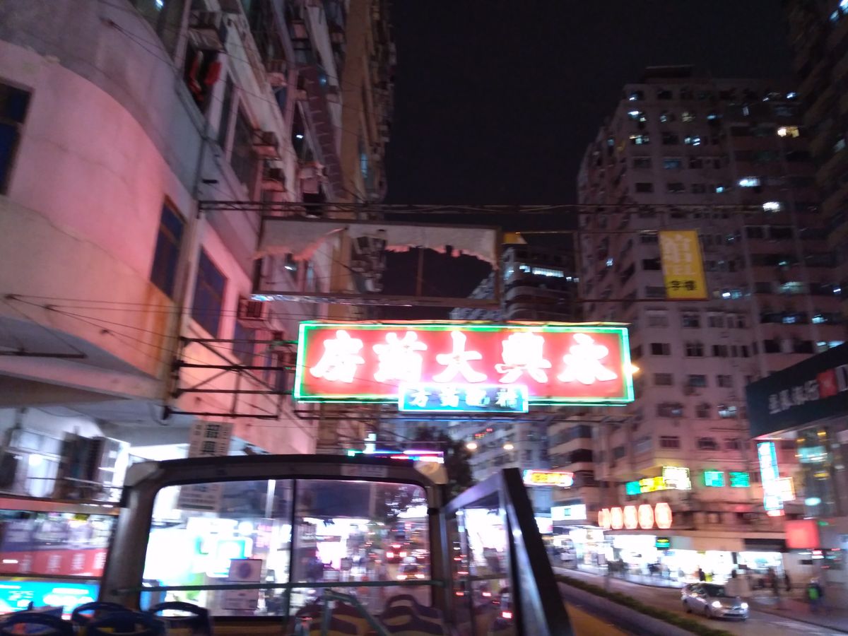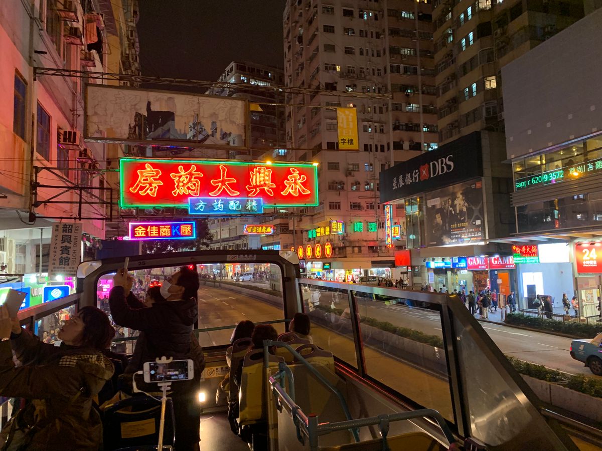 バスは対岸の香港島の高層ビルの夜景から始まり、ジェットコースターのようにトンネルをくぐり、後半は古き良き街のネオンを楽しむことができました。
