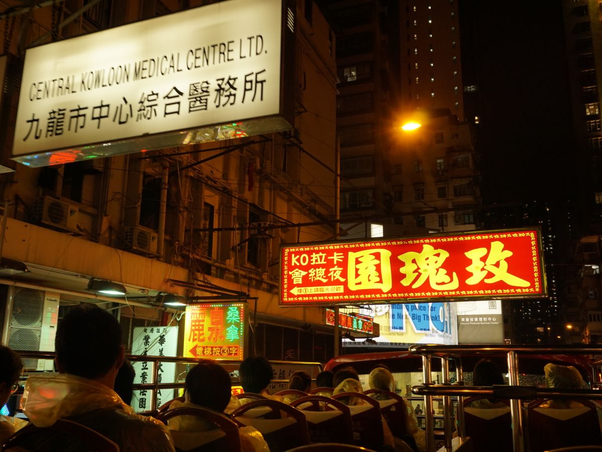 楽しみにしていたものの,当日は大雨。レインコートを着ての参加となりましたが,その日は金曜日だったこともあってか渋滞もひどく,雨によるスリップを回避するためもあってか,7年前に感じたスリリングさはありませんでした。そういえば,昔は街中の大型看板をスレスレに抜けるのが醍醐味だった気がしますが,現在の香港は,看板の数も照明の煌びやかさも何だか半減してしまったような気がします。
