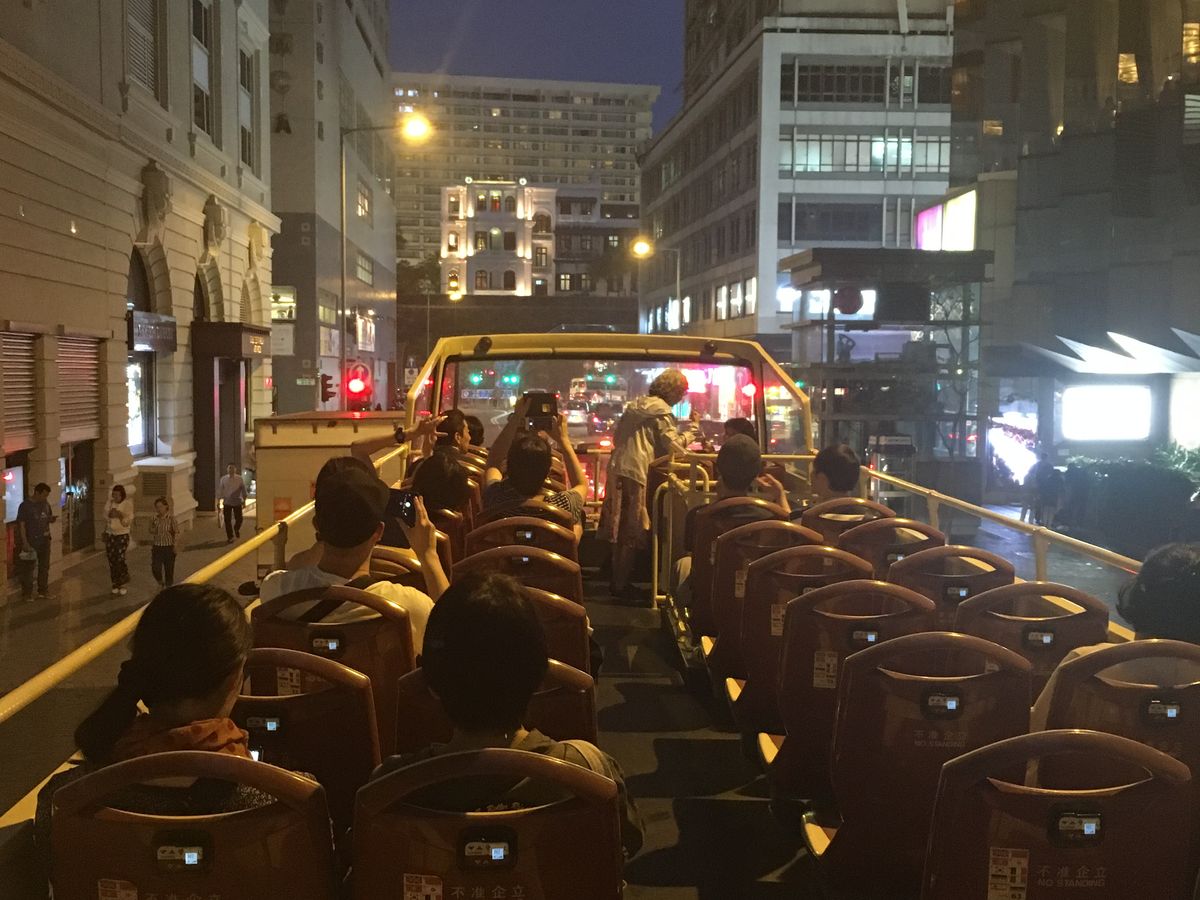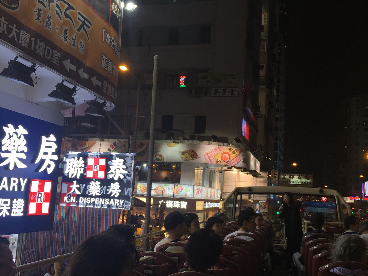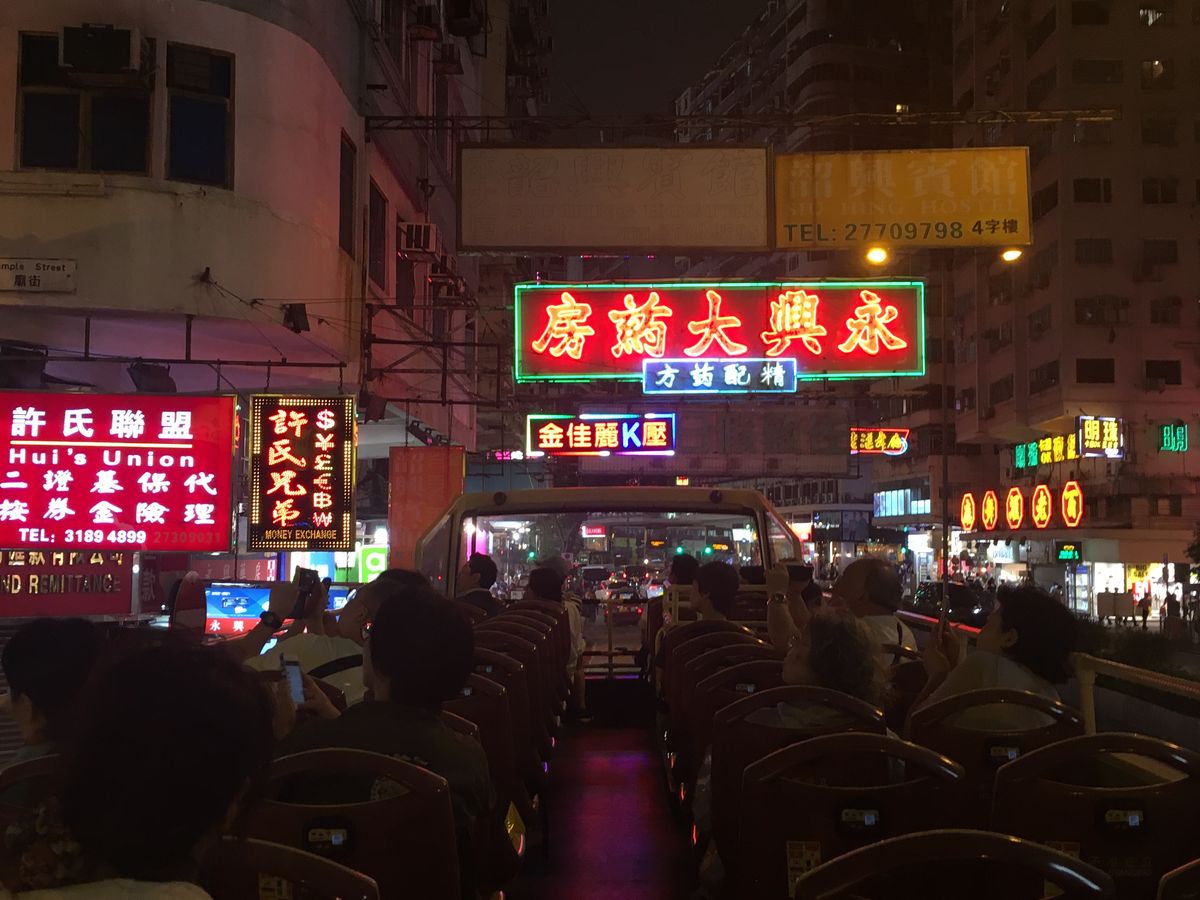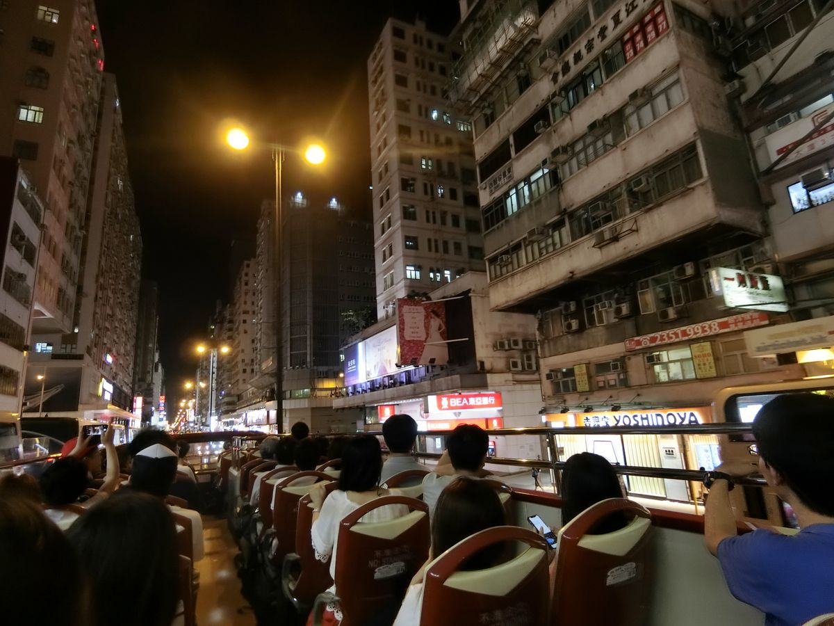 念願だった香港オープントップバスに乗車してきました。集合は19:00にカオルーンホテルのロビーでした。参加者にはパンダのシールが渡され衣服に貼り付けました。日本語を話せる現地のガイドさんとオープントップバスに乗り込みます。当日の参加者は20名弱でしたので、全員が2階席に座れました。ドライブルートはハーバー沿いを通りトンネルを抜けネオンの下を通過し女人街に向かいました。女人街で下車して解散することもできましたが、集合場所であったカオルーンホテルまで乗車しました。当日は肌寒かったのですがオープントップバスのスリルを味うことができました。日本語ガイドさんも流暢に説明をしてくれて楽しく過ごすことができました。