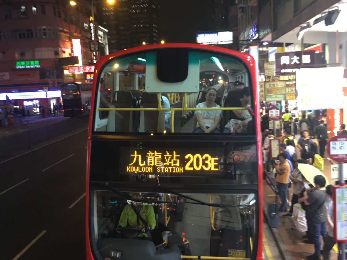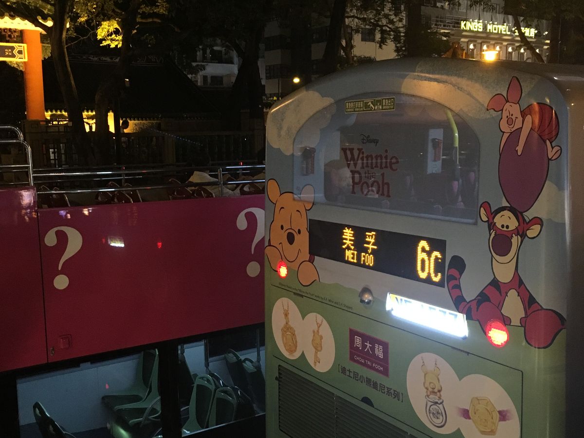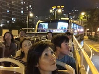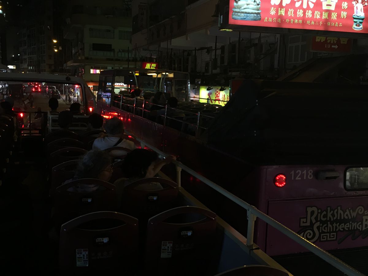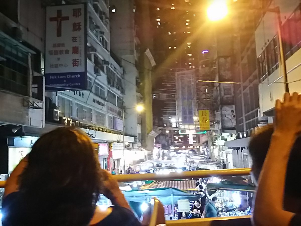 念願だった香港オープントップバスに乗車してきました。集合は19:00にカオルーンホテルのロビーでした。参加者にはパンダのシールが渡され衣服に貼り付けました。日本語を話せる現地のガイドさんとオープントップバスに乗り込みます。当日の参加者は20名弱でしたので、全員が2階席に座れました。ドライブルートはハーバー沿いを通りトンネルを抜けネオンの下を通過し女人街に向かいました。女人街で下車して解散することもできましたが、集合場所であったカオルーンホテルまで乗車しました。当日は肌寒かったのですがオープントップバスのスリルを味うことができました。日本語ガイドさんも流暢に説明をしてくれて楽しく過ごすことができました。