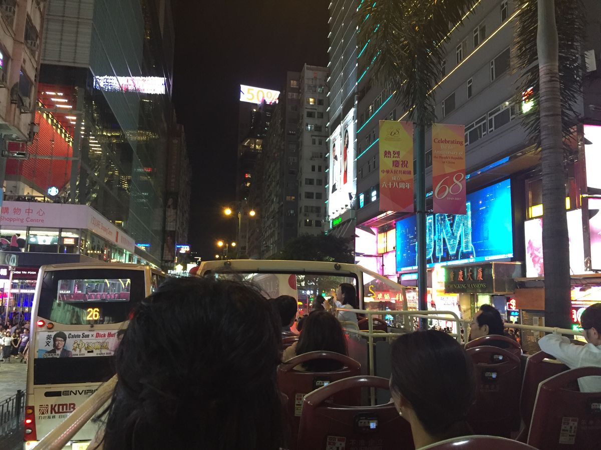 天気が良かったので、風がとっても気持ちよかったです。2階席から眺めるネオンの街もとっても綺麗でした。同じところを2、3周してから女人街前まで行き、下車しました。1時間ぐらい乗っていたので、コスパは良かったのではないかと思います。女人街からチムサーチョイまでも、メトロで3駅だったので交通も便利でした。