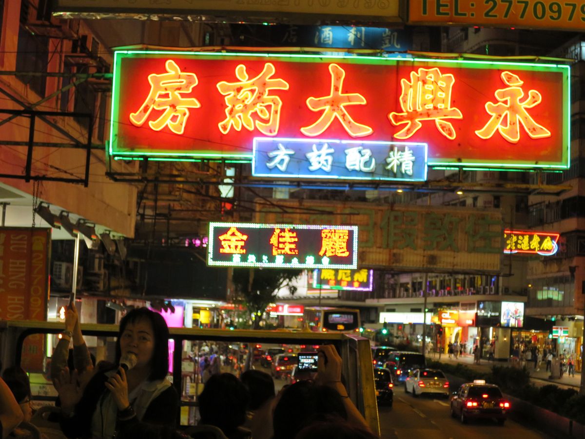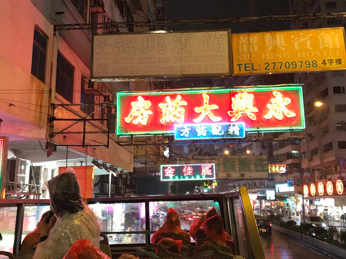 香港の夜の街を、オープントップバスで疾走するのは、スリル満点で、夜風がとても気持ちのいいものでした。