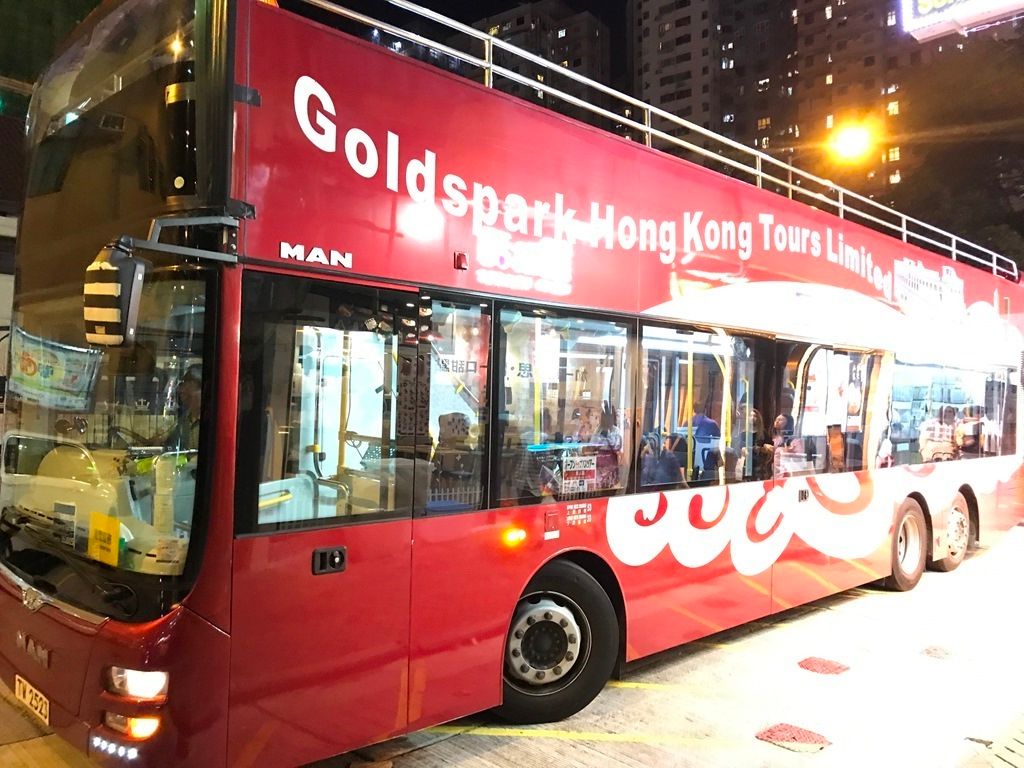 初めての香港だったので、王道のツアーを選びました。その日お昼は結構な大雨で行けるか不安でしたが、19時からの予約だったのでなんとか雨も止んでオープトップバスも楽しめました。バスは大通り高速道路などを回って夜景の写真スポットで停車して写真撮影をして海と夜景は良い景色でした☆