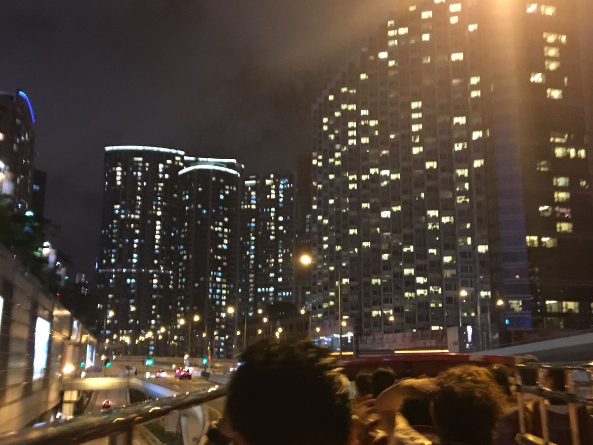 ビクトリアピークはガスって上からは見れませんでしたが 少し下がったところでバスを止めて夜景が見えて綺麗でした。夜の街をオープントップバスで走るのは、気持ちよかったです。もう少しスピードが出ていたらもっと面白かったかも(^o^)