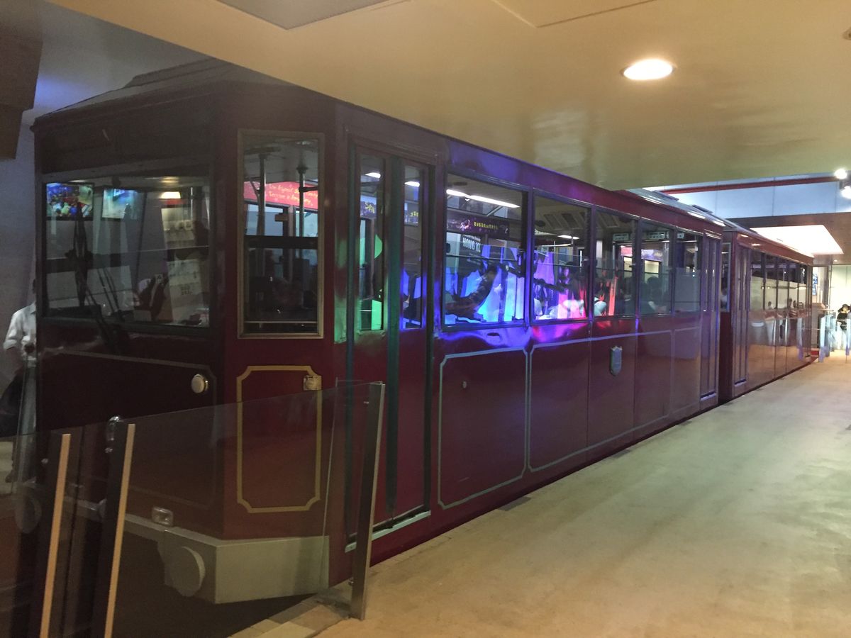 ピークトラム乗り場に着くとなんと!人、人、人のやまだかり1時間程並んで(優先だったのでまだまし?優先でなかったら2時間以上待つはめに!優先のツアーで良かった)2両編成のピークトラムに乗り急な坂を登り山頂へ!