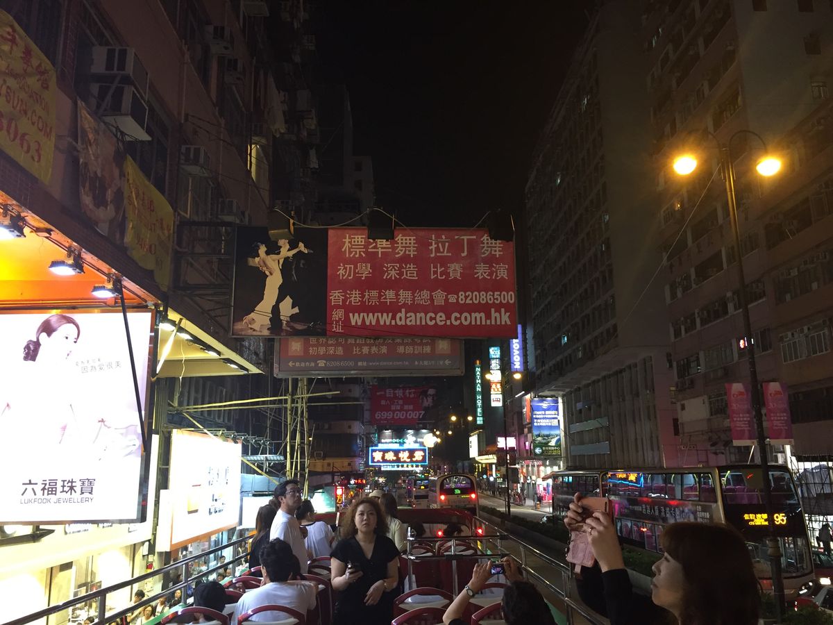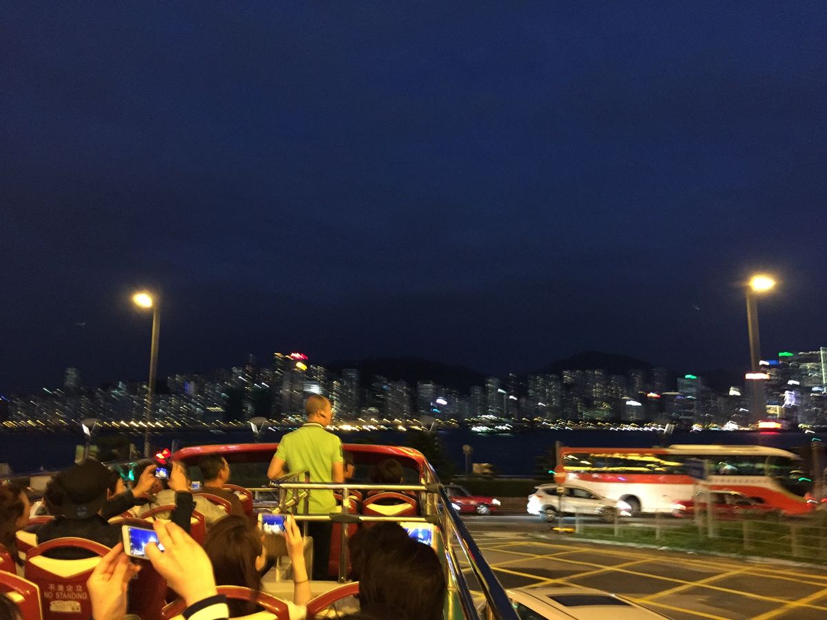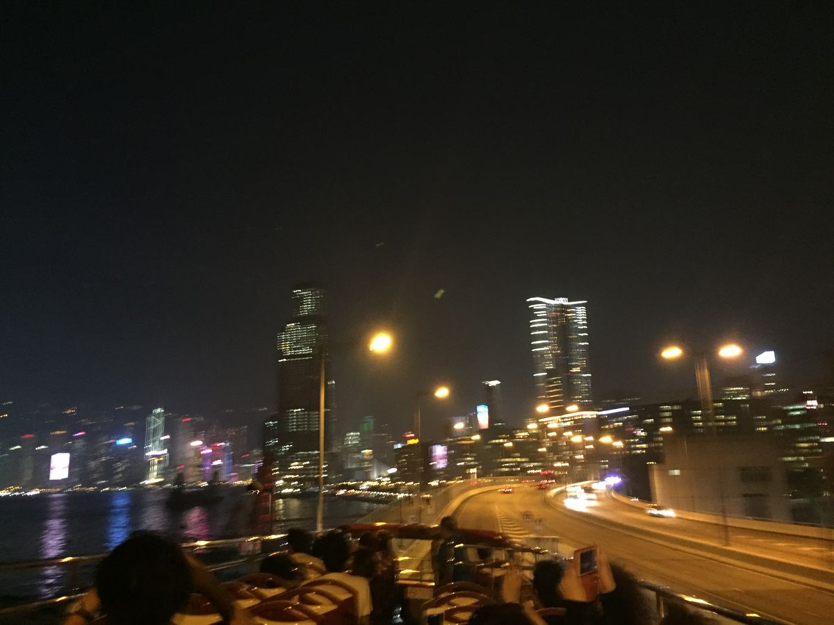 その後はまたバスで移動しオープントップバスに乗り込み、香港の街並みを見学。ザ!香港といった景色を見られて大満足です。写真をたくさん撮りました。それにしてもその日は土曜日だったせいか、夜も遅いのに人がたくさん出歩いていて驚きです。