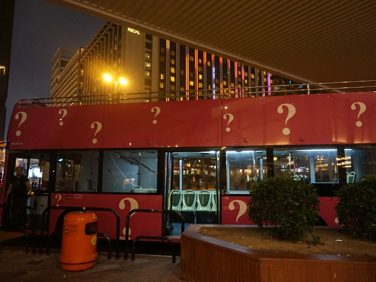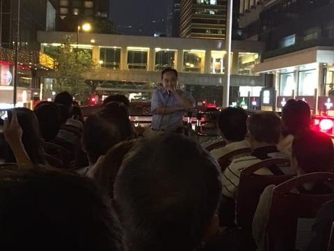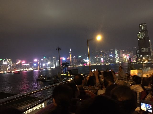 次に香港のネオン看板の街中をオープントップバスで疾走!雨もなく夜風に当たりながら気持ちのいいひとときでした。ガイドさんがわざわざ2階まで来て写真を撮ってくれたりサービス良かったです。