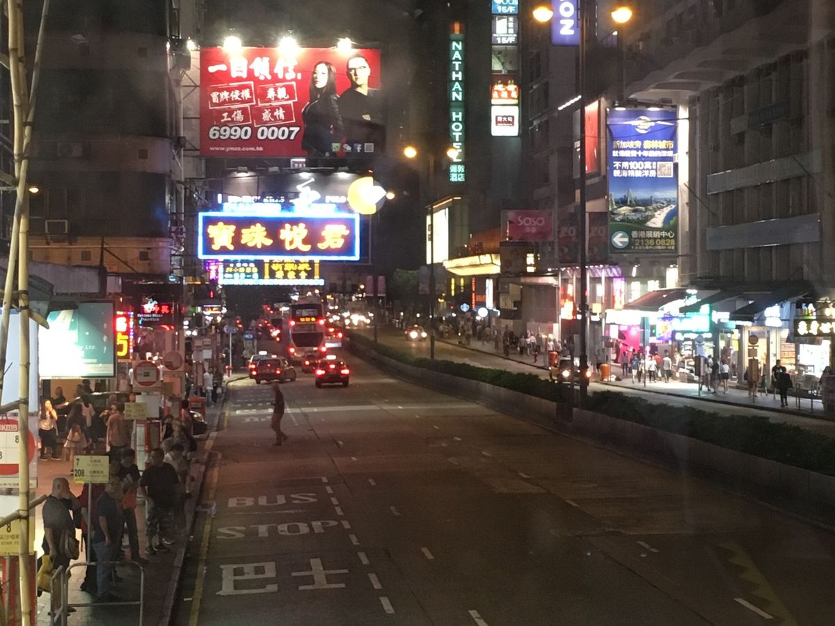 ネイザンロードを、看板にあたる様な雰囲気で走るオープントップバスに乗って香港の第1章を満喫出来ました。