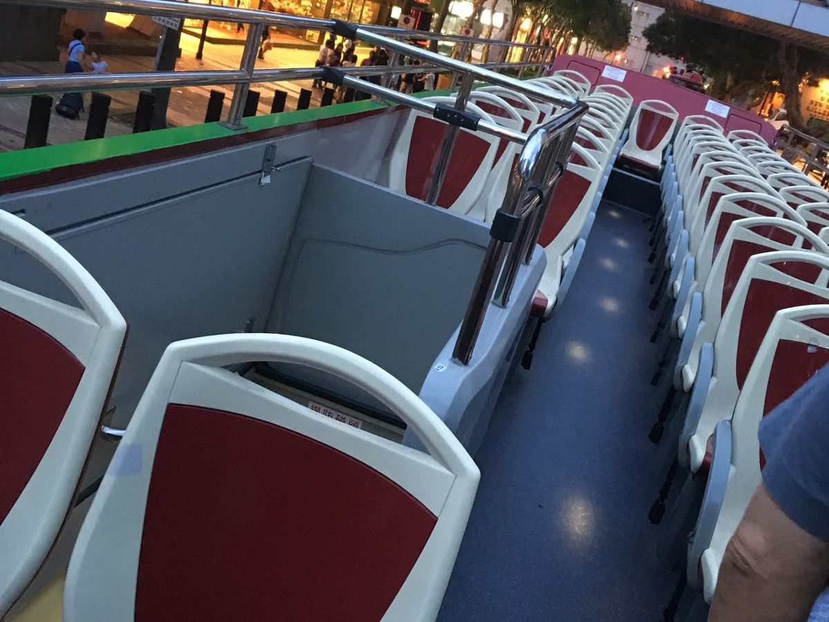 オープントップバスは、乗り込む時点で席順が決められていて、ほぼ満席だったかと思います。ほろ酔いの身体に、夜風がとても気持ちよく、高い位置からの眺めは最高でした。しかし、想像していたよりは、看板は少なく、看板すれすれ感のドキドキ要素は、まるで無かったです。降車して、女人街周辺を自由に歩け、夜の街で、少しショッピングができたのも、良かったです。夕食後のお散歩兼ねての参加に、とても、おすすめのツアーだと思います。