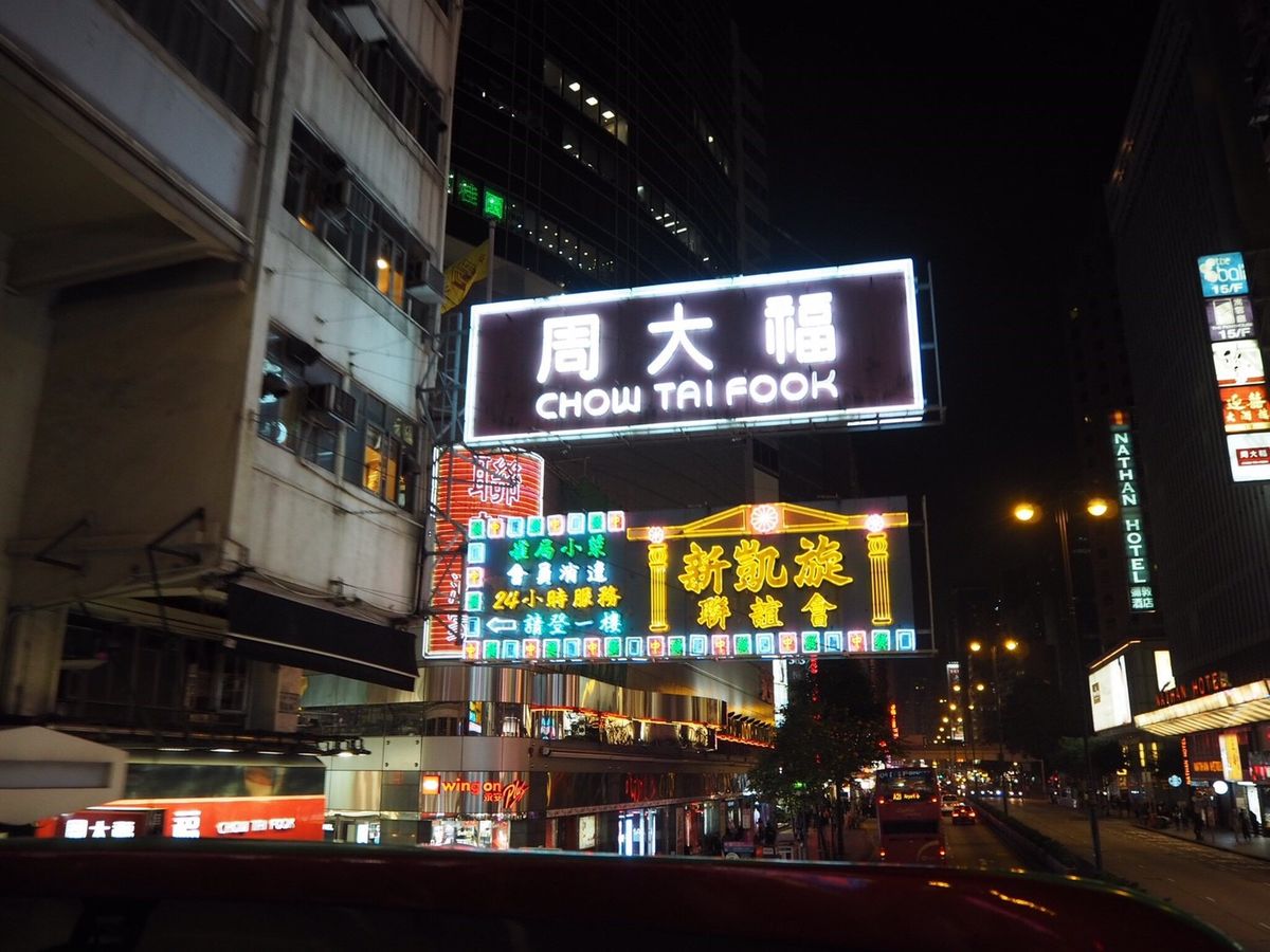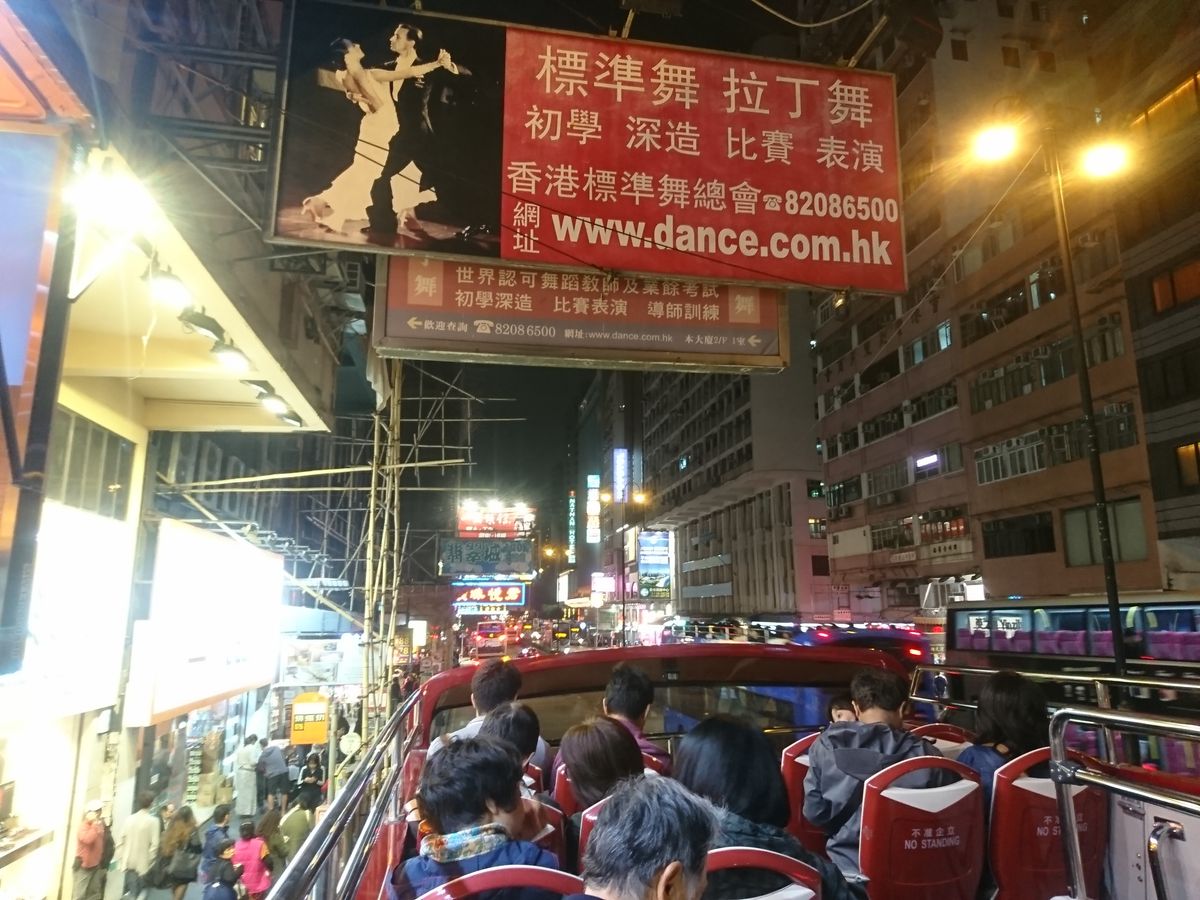 二階建てバスでは派手派手の看板には手が届きそうな位で、活気ある香港の夜の街を実際に感じることができます。
