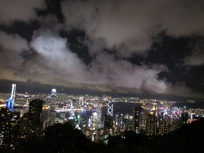 私たちが行った時は、やや曇り空だったのですが、それはそれで、雲に香港のライトが反射し、幻想的でした。
