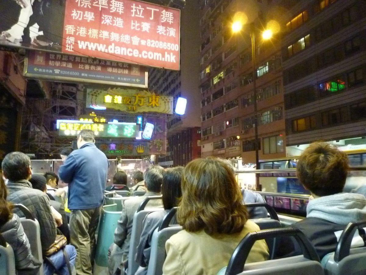 ネオン街を走るオープントップバス。これぞまさに香港!