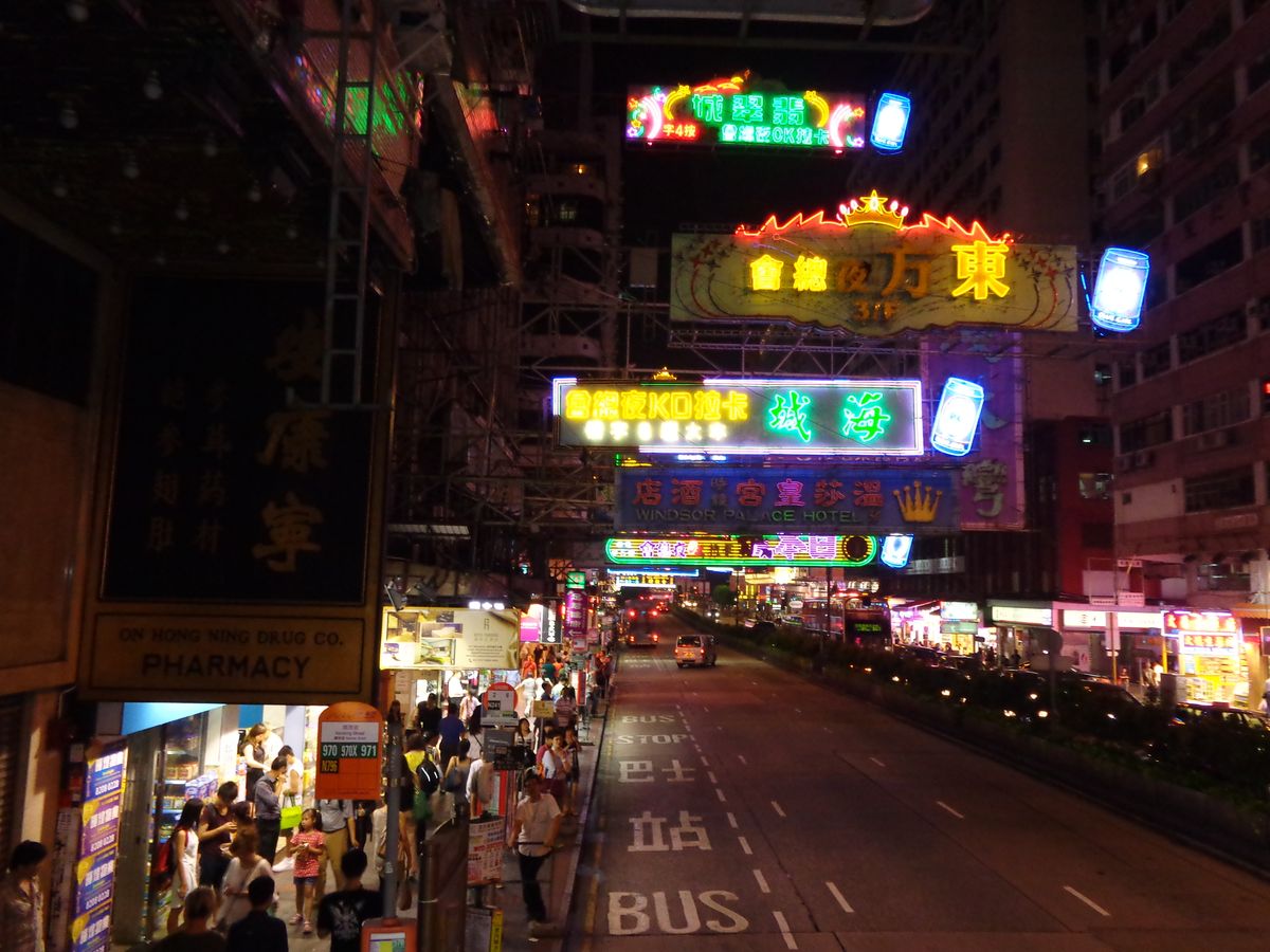 It was a great pleasure to see a night scenery from top of the bus roof. Hundreds of signboads decorated with glittering neon and crowded roads made us feel that we were now in Hong Kong.