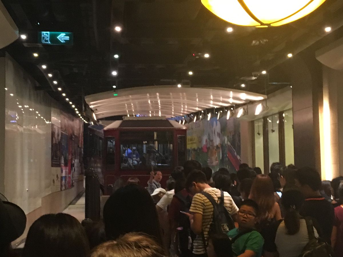 ヴィクトリアピークへはバスを乗り換え、トラムの駅へ向かいます。すごく混むことが多いと言われていたのですが、この日はデモが行われていた影響でトラムの駅にはほとんど人は居なくて、私たちは並ぶこともなくホームへ入り、すぐトラムに乗車することができました。こればかりは運です。混んでいる時はかなり待つそうです。トラムは急坂を登って行くため、途中の高層マンションが曲がって見えたのが面白かったです。