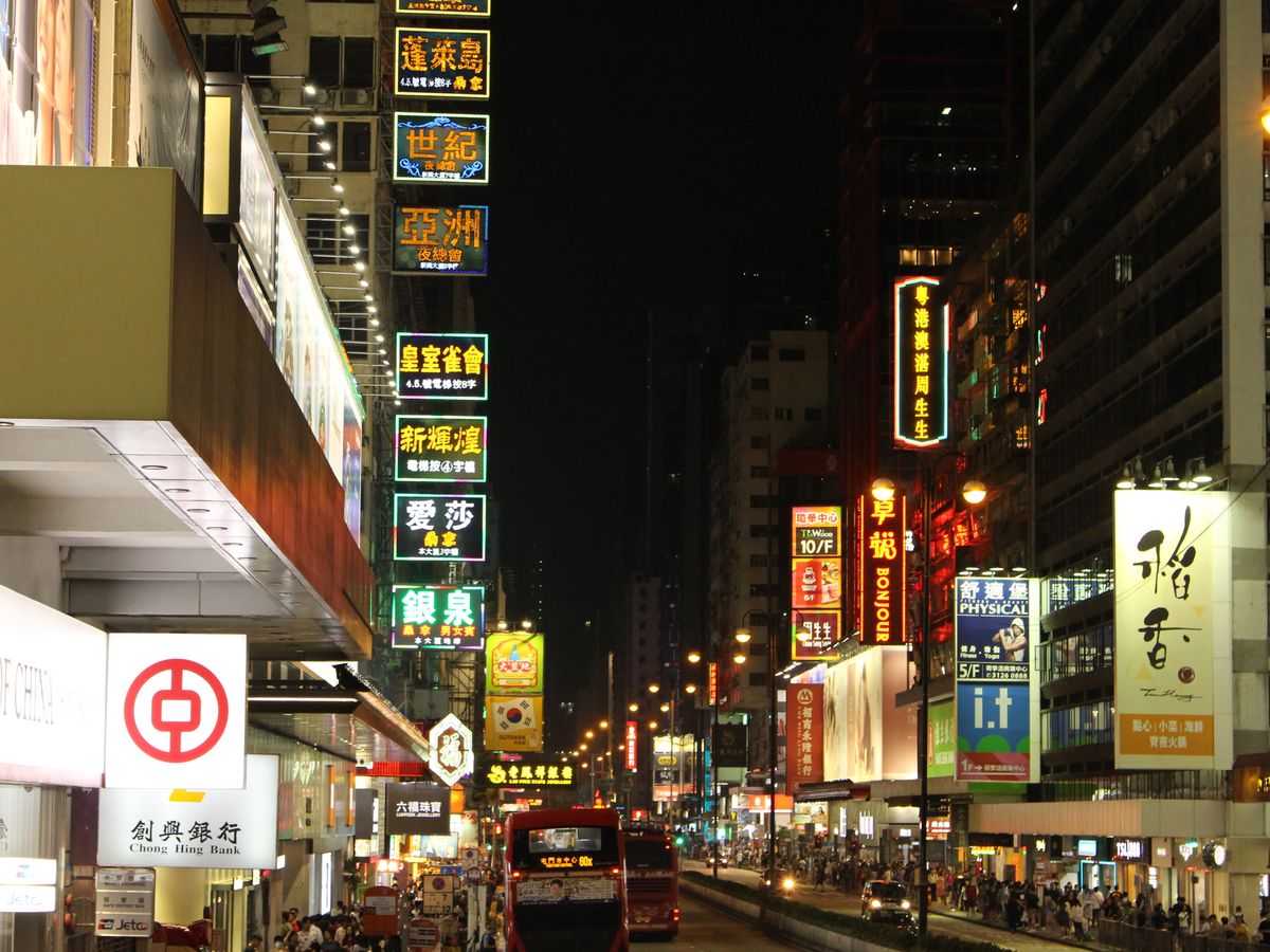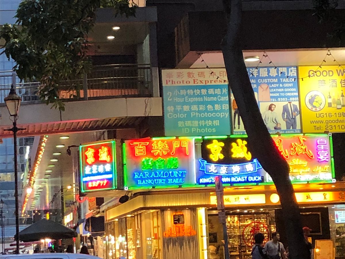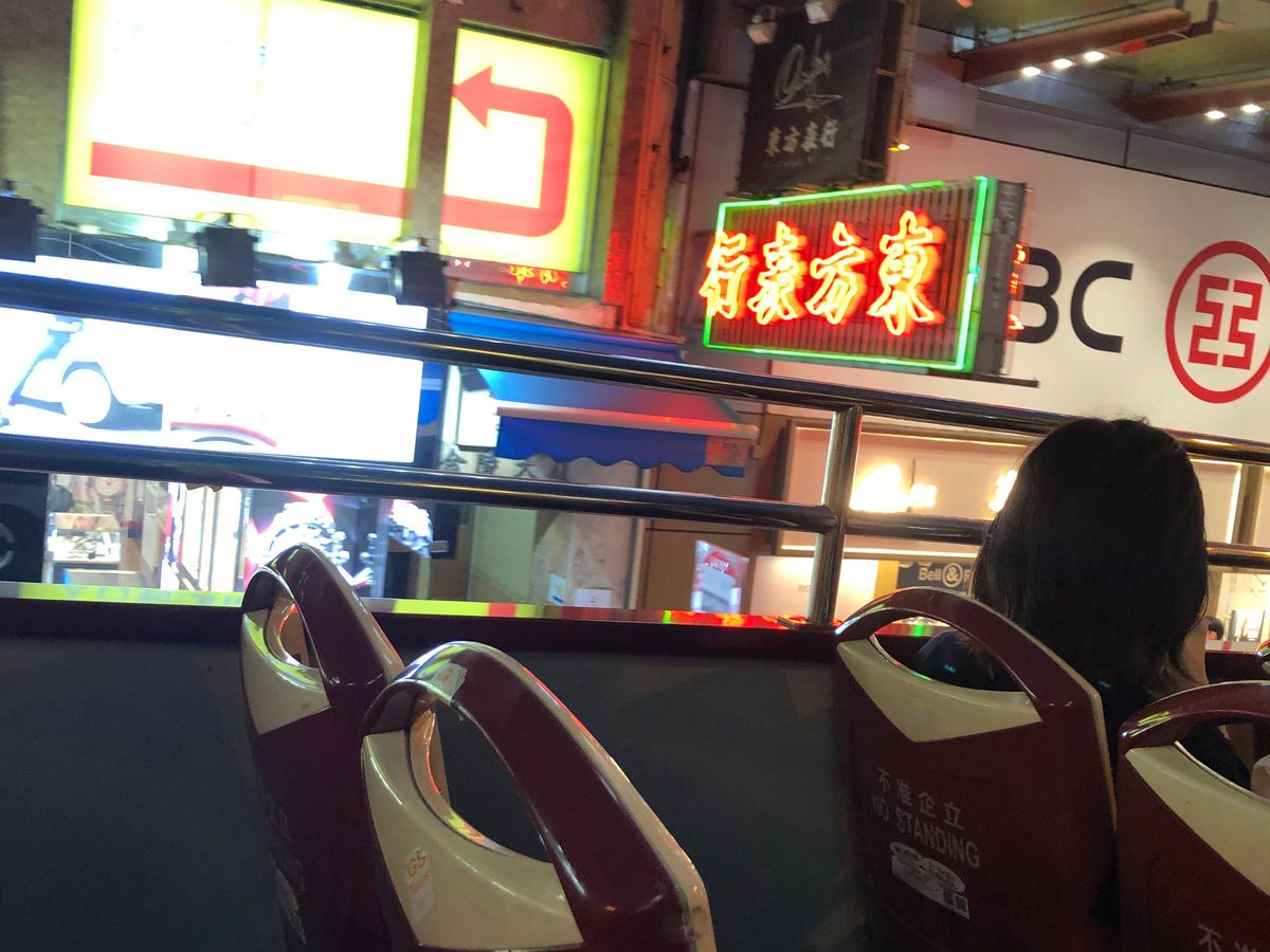 集合場所よりほぼ定刻にオープントップバスは出発。まずは湾沿いの道路を結構なスピードで走ります。そのまま加速しながらトンネルに入ると上のライトが頭に当たりそうな感覚でスリル満点。そこからネイサンロードに入り女人街の方までネオン街を進んで行きました。道路に突き出している看板は、その多くが老朽化で取り外されたそうで数はありませんでしたが、じゅうぶん楽しめました。ちなみにバスは右側に座った方が街が見えやすいです。