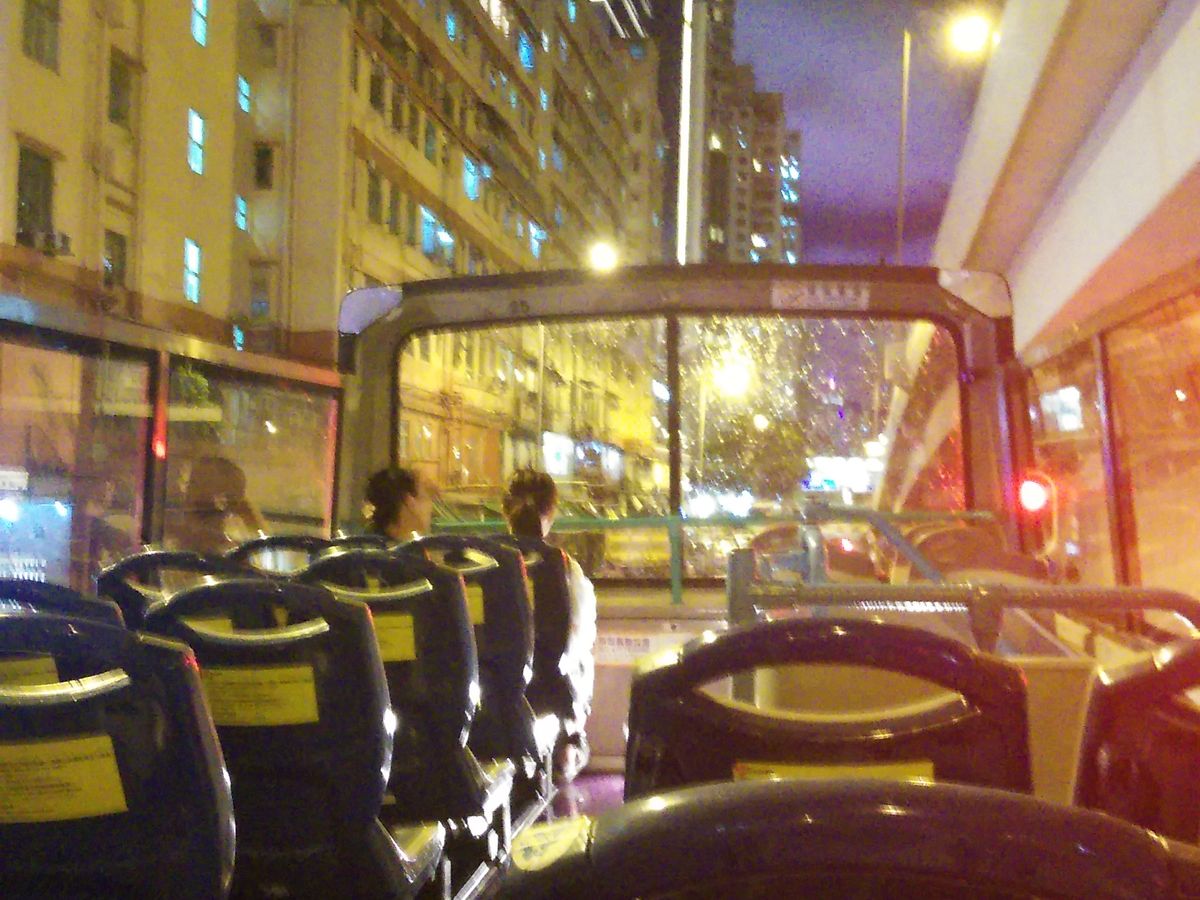 子供が楽しみにしていたオープントップバス。2階の一番前の席に座りました。シートベルトに慣れているせいか、シートベルトの無いドライブが私は怖かった。しかも運転手さん、結構飛ばし屋さんで、足を踏ん張っていないとお尻が椅子を右に左にスルスルと滑りました。事故もなく無事に女人街に着いて安心しました。