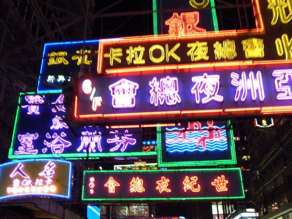 香港ならではの大きくて派手な看板の頭上スレスレで